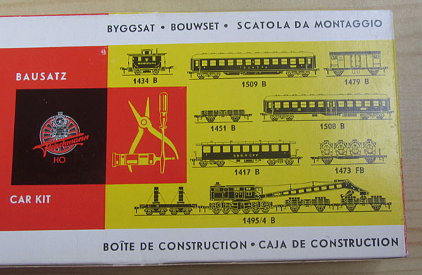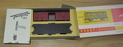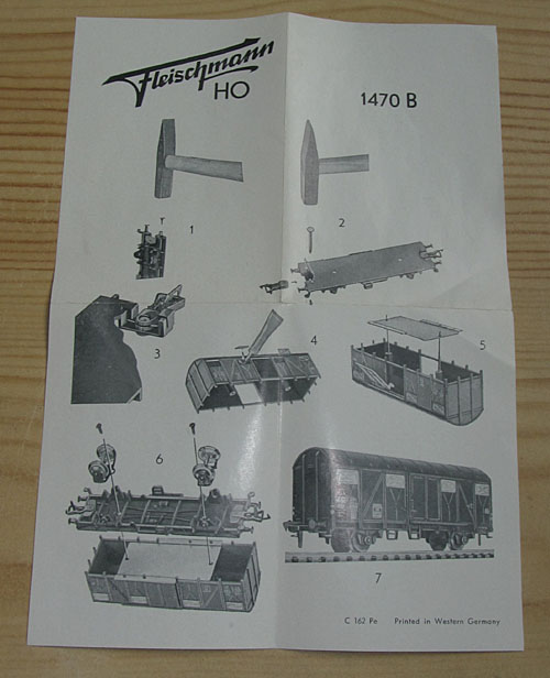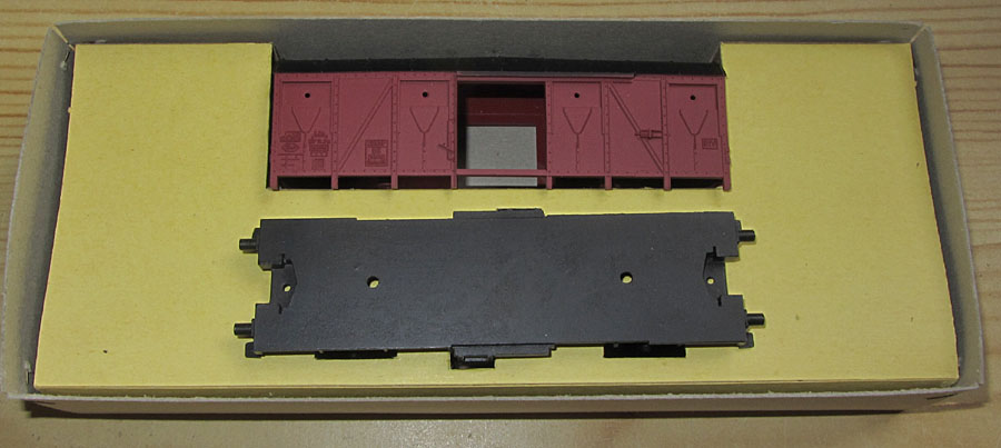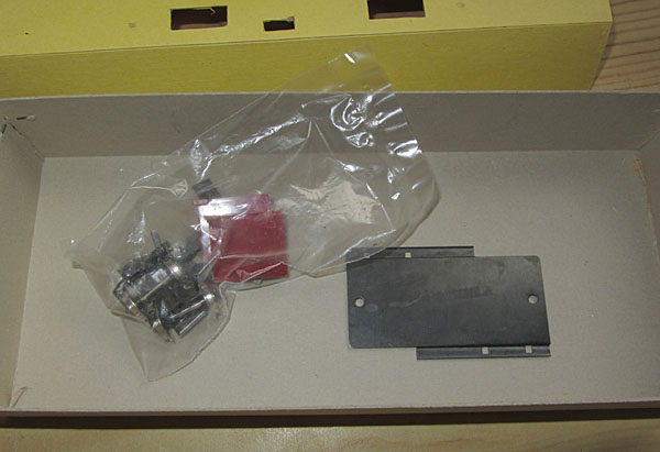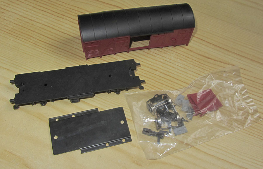 beiden Achsen mit Halterungen, zwei Kupplungen mit feinen Federdrähten, die Puffer, die 8 silbernen Klappen für die Seitenwände, sowie 2 Nieten für die Kupplungesbefestigung und zwei Schrauben für die