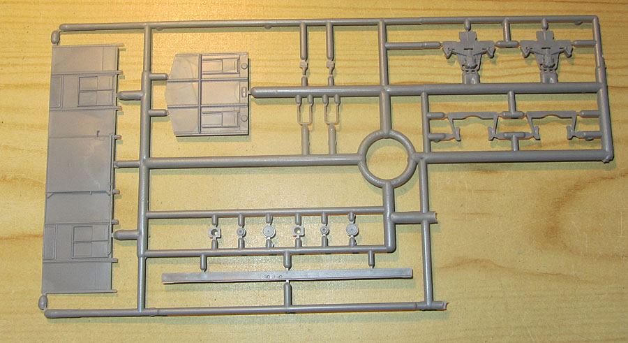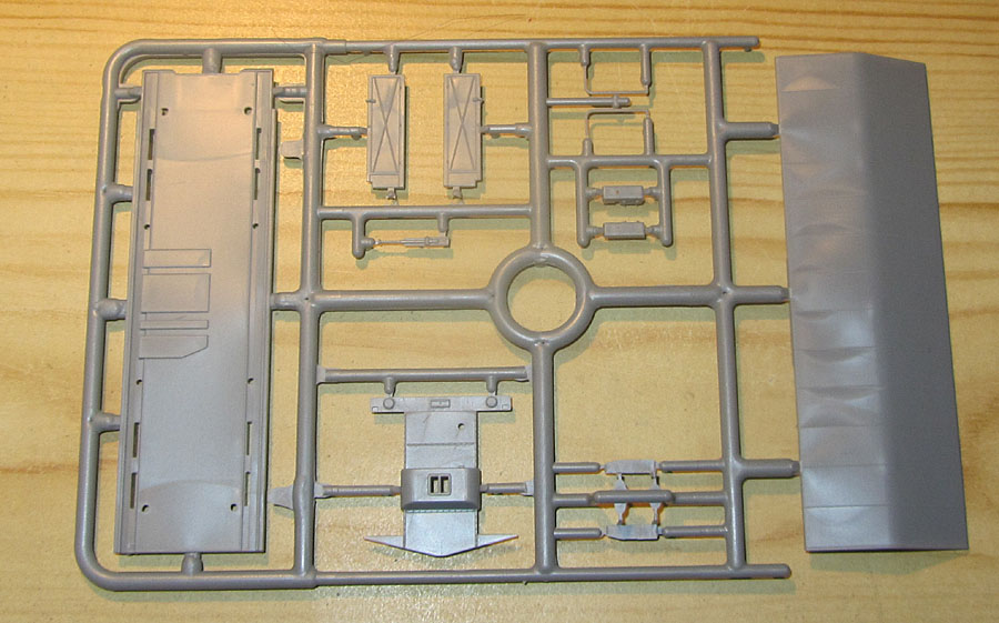 Dach und die Teile des Bremserhauses. Die beiden anderen grauen Rahmen sind identisch mit den Seiten- und Stirnwänden, Achslagerblenden und weiteren Kleinteilen.