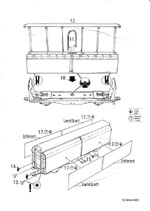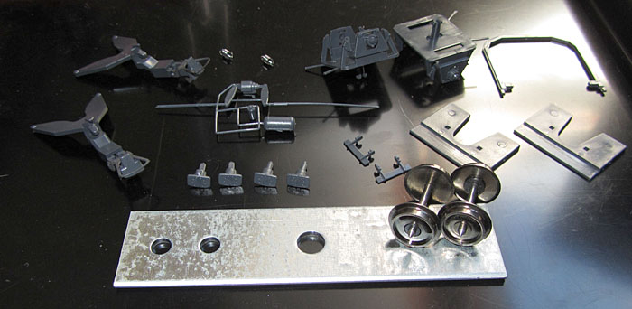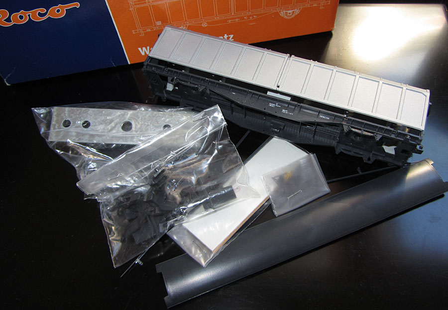 Kunststoffteile. Das sind Teile für die Kupplungen mit den NEM-Schächten, die Achshalter, Puffer, Trittstufen, Rückstellfedern, Wagenbodendetails und der Rahmen zwischen den Schiebewänden.