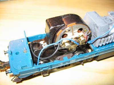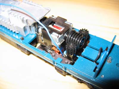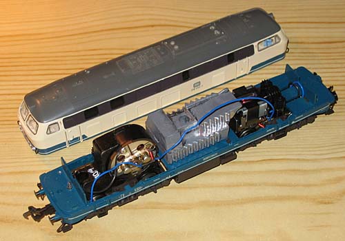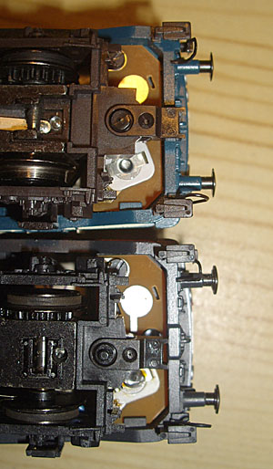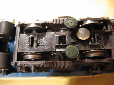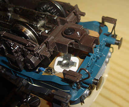 Eine relativ mittig zwischen den Aggregatnachbildungen, die andere ist nahe zu einem Drehgestell versetzt. Bei allen älteren Modellen ist die mittige Schraube für die Gehäusebefestigung, die andere für die