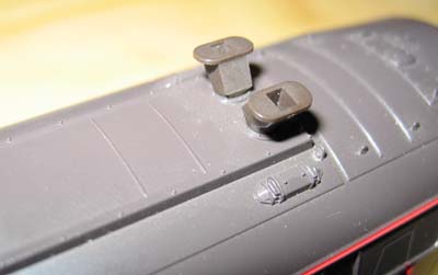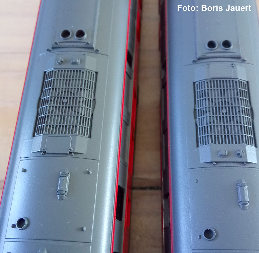 Fleischmann hat auch dieses Detail berücksichtigt und dem Modell diese Teile spendiert. Diese wurden einfach in die Dachvertiefungen eingesteckt und mit etwas Klebstoff fixiert. Bei den Einfachmodellen fehlen sie