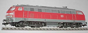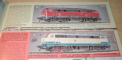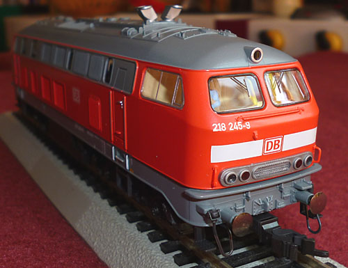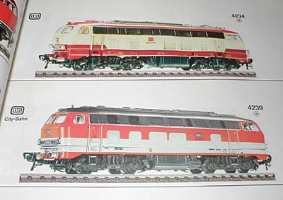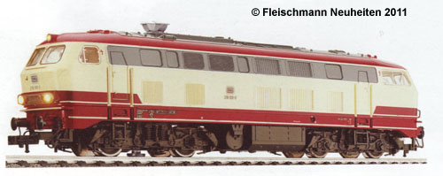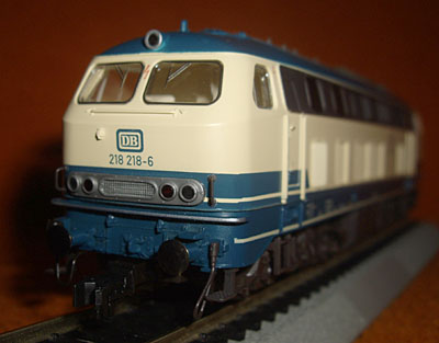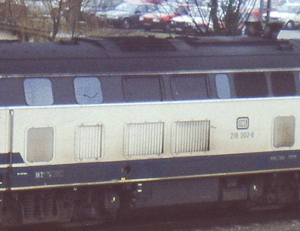 Mit der sehr attraktiven Lackierung beige/rot war die 218 217-8 beim Vorbild versehen worden, als es um die Festlegung des neuen Farbschemas der DB im Jahr 1974 ging. Das Modell dazu kam als Neuheit 1984/85 in den Katalog. Da das Vorbild aus einer früheren Bauserie stammte, änderte Fleischmann erneut die Dachlüfter und spendierte dem Modell Blattfederdrehgestelle mit Achslenkern. In der gleichen Ausführung erschien 1985 die 218 137-8 mit der orange/grauen City-Bahn Lackierung, wie sie inzwischen einige Vorbildloks erhalten hatten. Damit war eine weitere interessante Lackierungsvariante im Programm und passend dazu wurden von Fleischmann auch die umlackierten Silberlinge angeboten. |