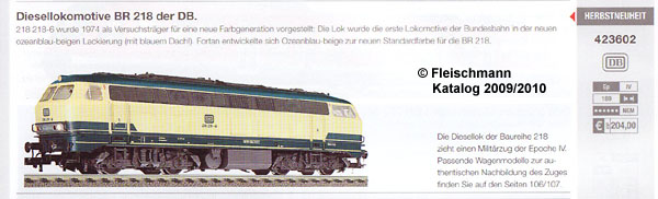 Das Jahr 2008 war aber auch das Jahr, in dem Fleischmann in erhebliche finanzielle Probleme geriet. Schließlich wurde Fleischmann von der Modelleisenbahn Holding GmbH, zu der schon Roco (Roco Modelleisenbahn GmbH) gehörte, übernommen. Dabei wurde angekündigt, dass Fleischmann künftig für ein Vollsortiment in Spur N stehen wird und in H0 den Bereich der historischen und nostalgischen Modelle abdecken soll. Damit wurde die Luft für die 218 im Fleischmann Segment dünn. So war 2009 im Neuheitenprospekt auch keine weitere 218 zu entdecken. |