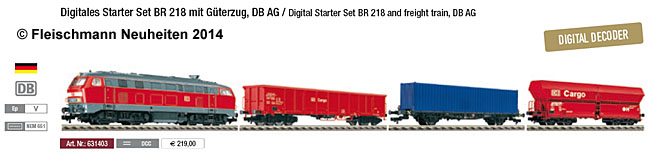 So stellte sich im Katalog 2003/2004 das Fleischmann Programm der 218er wie folgt dar: Startpackungen: 6367 Regionalexpress mit 218 410-9 (verkehrsrot), 6393 Start-Set des Jahres mit 218 299-6 (altrot), 86393 Start-Set des Jahres Digital mit 218 302-8 (altrot), 66369 Start-Set Digital mit 218 301-0 (verkehrsrot). Altrot: 218 227-7 als Schienenreinigungslok (4938) und Schienenreinigungslok digital (64938). Beige/türkis: 218 421-6 in Normal- und Digitalversion (4233 bzw. 64233), 218 420-8 als digitale Soundlok für Gleichstrom (74233) und Wechselstrom (1233). Verkehrsrot: 218 225-1 bzw. 218 356-4 (?) in Normal- und Digitalversion (4236, bzw. 64236). |