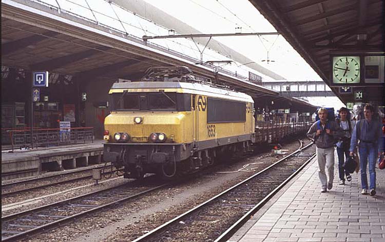Am 05.08.1985 zieht die 1653 einen Güterzug durch Amsterdam Hauptbahnhof.