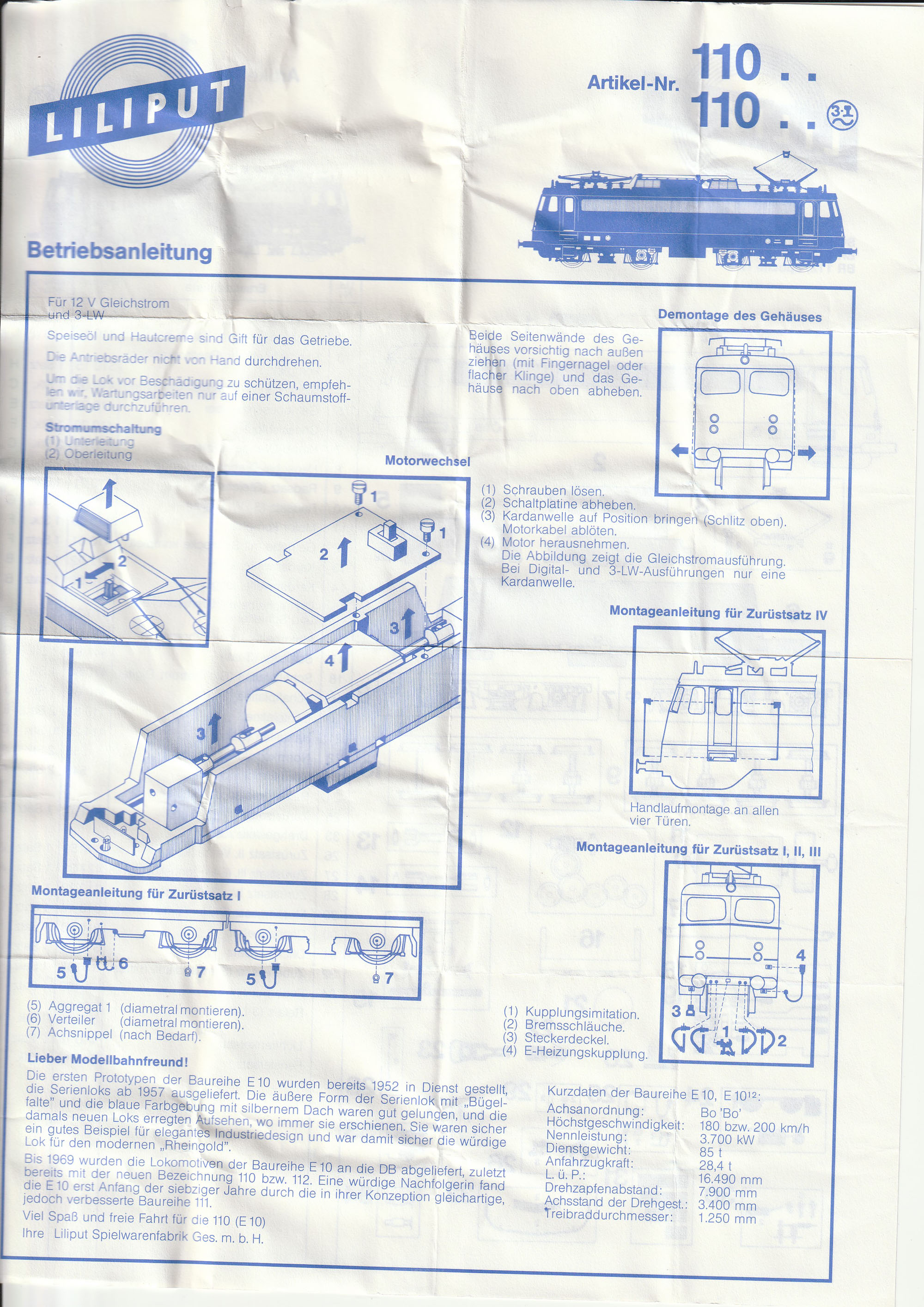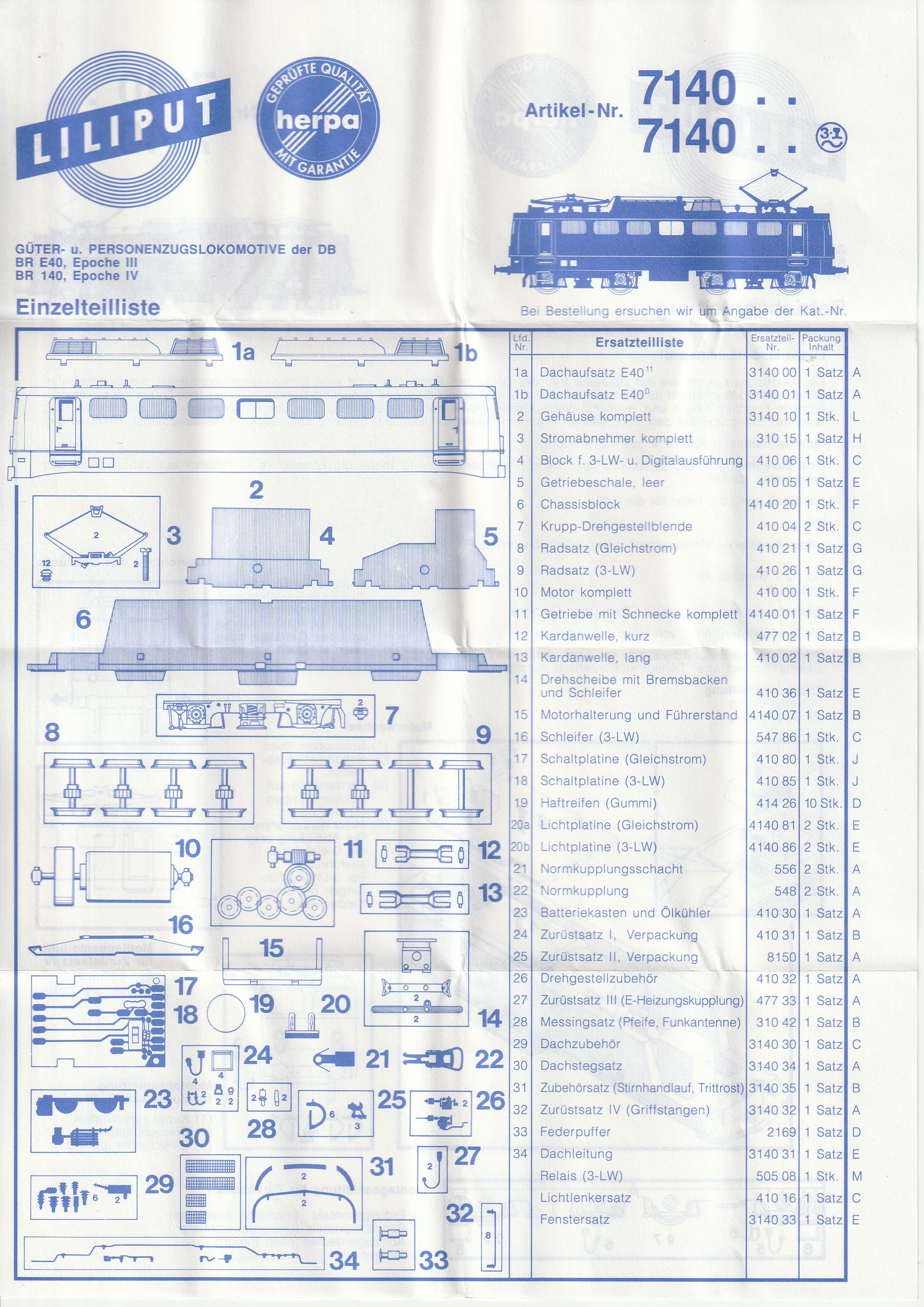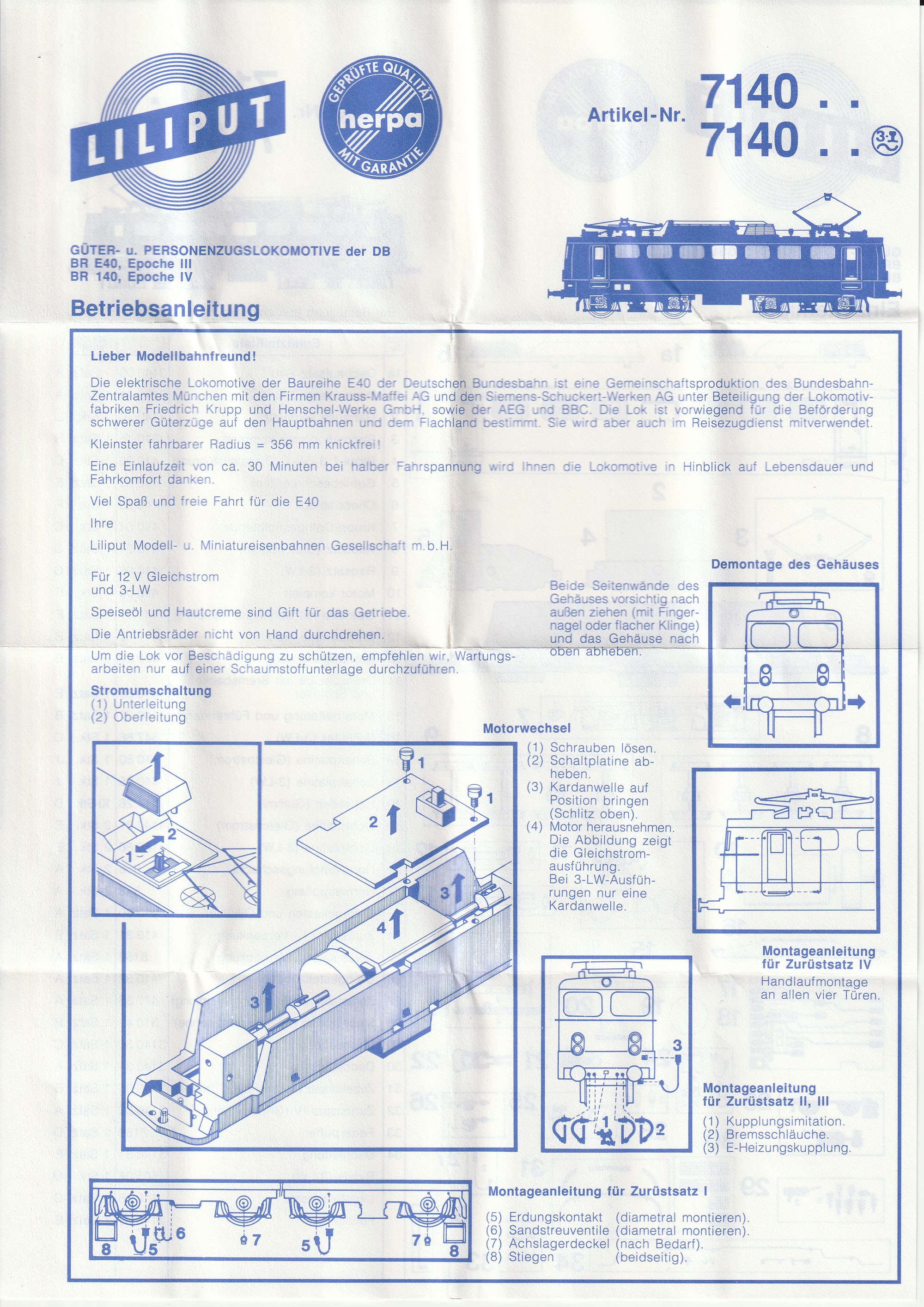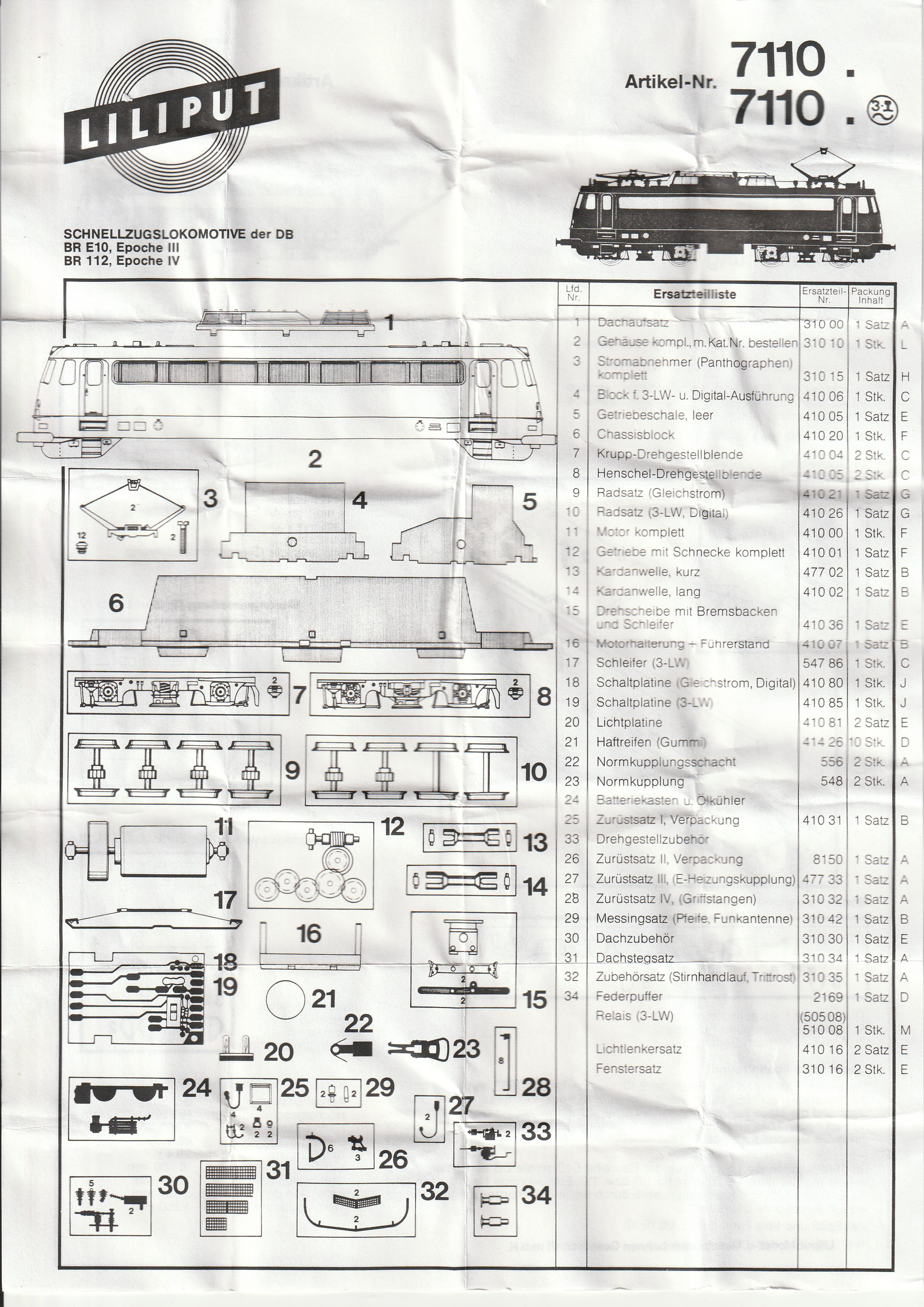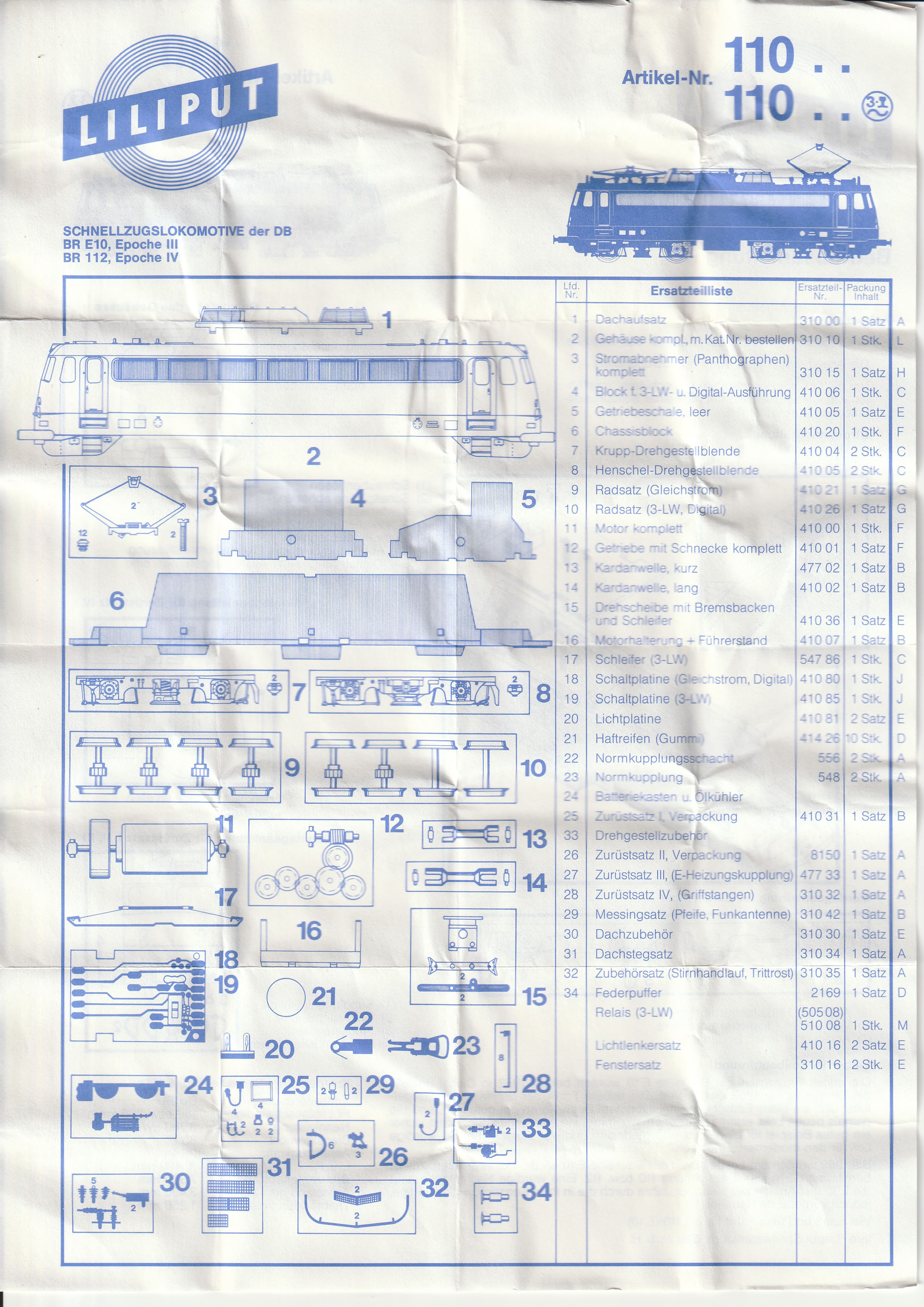 Allen Modellen lag auch eine Beschreibung bei, welche auf der einen Seite neben der allgemeinen Beschreibung auch die Anbringung der Zurüstteile zeigte, auf der anderen Seite des DIN A4 Blatts war eine Ersatzteilliste zu sehen. Auch wenn es das Modell schon lange nicht mehr gibt und keine Ersatzteilversorgung vom Hersteller mehr exisitiert, möchte ich die Anleitung hier trotzdem zeigen. Vielleicht kann sie jemand brauchen oder druckt sie sich als Ergänzung zu seinem Modell aus. Die Anleitung war mehrfach gefaltet (darum sieht sie auch so “geknittert2 aus) und lag entweder auf der rechten Seite im Styropor ein (Liliput) oder war so zwischen Unter- und Oberteil eingeklemmt (Herpa) |