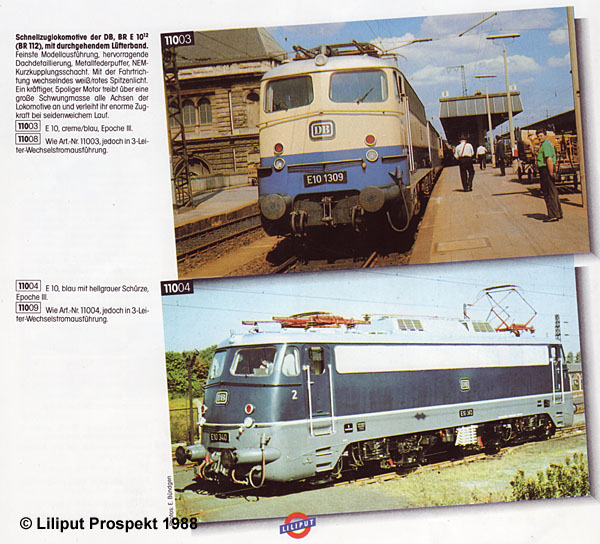 Der österreichische Hersteller Liliput kündigte daher 1988 im Prospekt “Höchste Eisenbahn” drei verschiedene neue Modelle der Bügelfalten E10 an. Mit Originalfotos wurden jeweils in Gleich- und Wechselstromausführung vorgestellt: