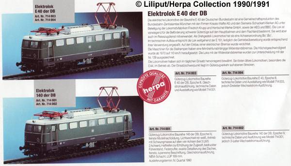 Aufgrund von Schwierigkeiten bei Liliput trat dann die bisher als Hersteller von Modellautos bekannte Firma Herpa als Vertreiber/Partner auf. Im ersten gemeinsamen Katalog 1990/1991 waren unter neuen Bestellnummern noch die E40 und die 140 in grün, sowie die Rheingold E10.12 abgebildet. Diesmal aber als Modelle, nicht als Vorbildfotos. Die Herpa Zeit war jedoch nur kurz, dann übernahm Bachmann die Firma Liliput.