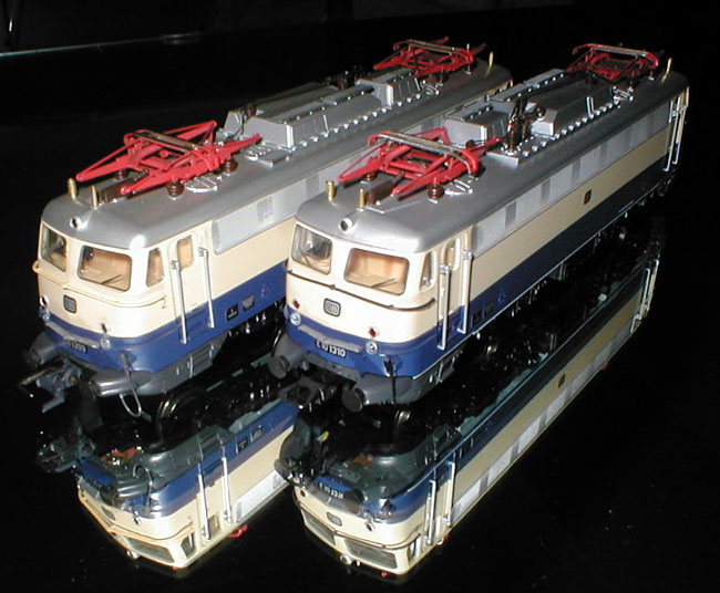 Rechts im Bild die zwei bekannten unterschiedlichen Versionen der Rheingold Bügelfalte: E10 1309 (ohne unteren Zierstreifen) und E10 1310