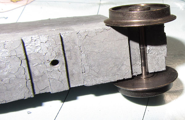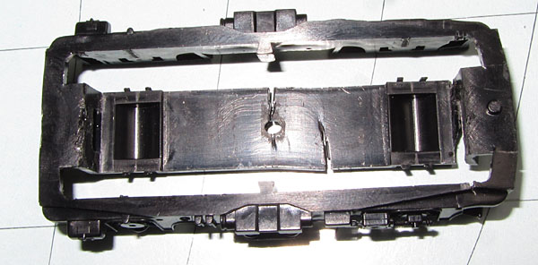 Der Lokrahmen und die Getriebeblöcke der angetriebenen Drehgestelle scheinen mir aus einem anderen Metall zu sein (evtl. gar kein Guss), als der Metallblock des Schleiferdrehgestells. Der ist ziemlich sicher ein Gussteil und er sah, vorsichtig ausgedrückt, gar nicht mehr gut aus. |