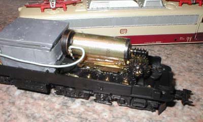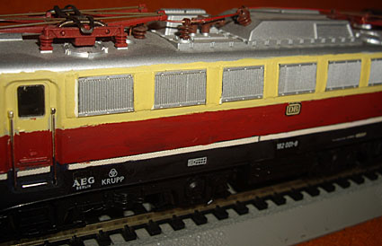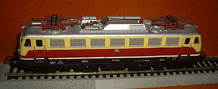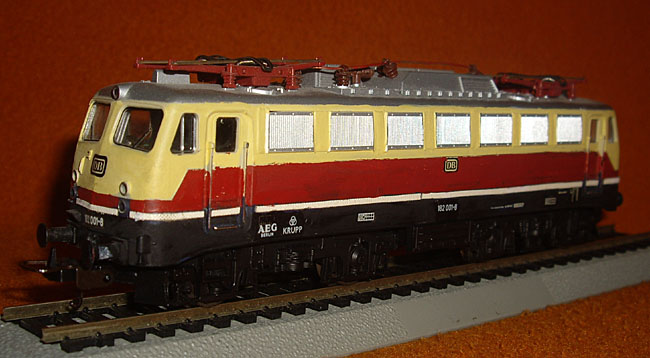 Diese Lima 110.3 wurde in eine 182 001-8 umgestaltet. Zwar ist die Lima 110.3 mit der Bügelfalte nicht die richtige Basis für einen solche Umlackierung (eine 110.1 wäre zutreffender), aber wenn es Spaß macht, ist es erlaubt! Sehr interessant ist, dass dabei die Lüftungsgitter bearbeitet und schmäler dargestellt wurden, um dem Vorbild näher zu kommen. Das ist eine durchaus interessante Idee. Leider ist die Neulackierung nur mit dem Pinsel erfolgt. Aber aus einiger Entfernung sieht es gar nicht so schlecht aus. |