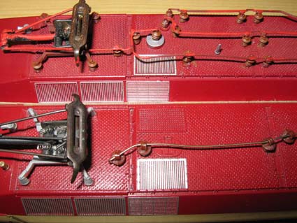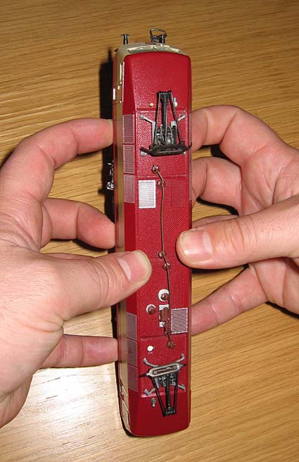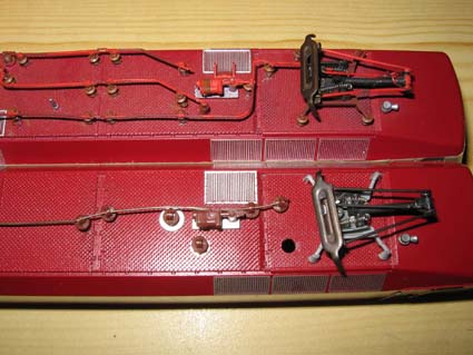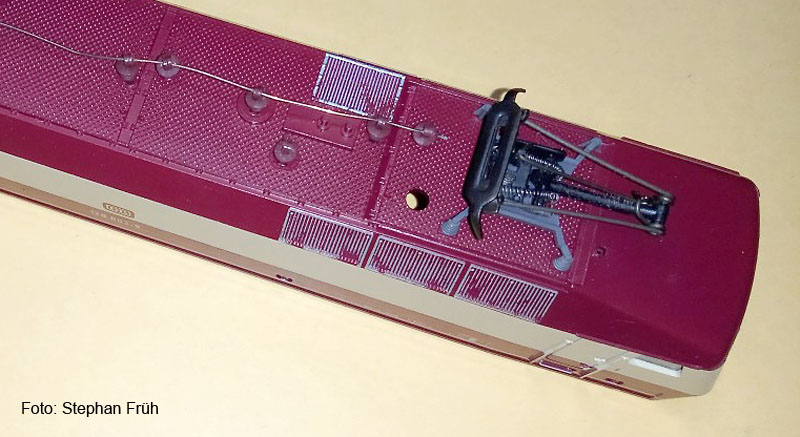 zwischen den Drehgestellen. Gleichzeitig wurde das Dachloch für die Umschaltung auf Oberleitung geschlossen. Der Umschalter befand sich nun im Inneren auf der Platine. Daran kann man diese Änderung von außen