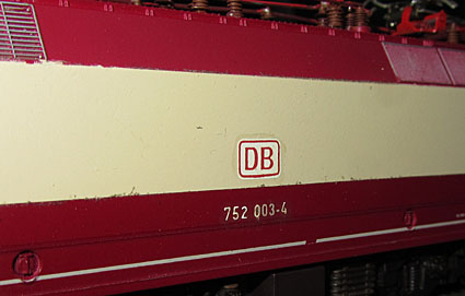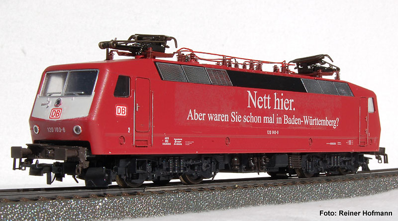 Wer jetzt glaubt, das war es, der hat sich getäuscht. Denn wenn man schon Fronten und Seiten mit unterschiedlichen Betriebsnummern bedruckt, warum solle man das nicht auch mit Seiten und Fronten machen...hä? Ja genau, es geht auch andersherum und es gibt tatsächlich auch die Version, bei der die Fronten mit 120 103-6 (wieder die falsche Computerprüfziffer) und die Seiten mit 120 140-9 bedruckt wurden. Hier ist das Beweisfoto dazu (die DBAG-Logos und die Werbebeschriftung wurde nachträglich aufgebracht). Jetzt fehlt nur noch die Version, bei der die Betriebsnummern auf dem Kopf sind - aber das gab es ja schon bei Märklin und der ehrwürdigen 900 68, äh 89 006. Es würde mich echt nicht mehr wundern, wenn das auch noch irgendwann auftaucht. |