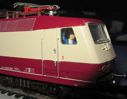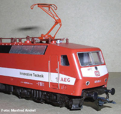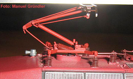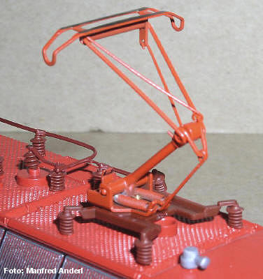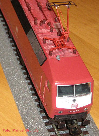 Eine Schwäche der Lima 120 ist der doch grob gestaltete und nicht vorbildgetreue Stromabnehmer auf dem Dach. Dem kann man aber mit einem vorbildgerechten Austauschteil von Sommerfeldt leicht abhelfen. Manfred Anderl hat hierzu den Sommerfeld Artikel 765 genommen. Die Auflage von Lima wurde weiterverwendet, nur zwei kleine Zapfen mussten weichen, damit der Stromabnehmer plan aufliegt. Es ist verblüffend, wie schnell damit der Dachbereich aufgewertet werden kann. |