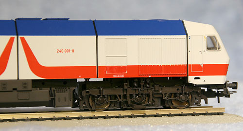 auch die angesetzte Pufferbohle und die Drehgestelldetaillierung sind gut gelungen. Dies gilt auch für den Aggregatebereich zwischen den Drehgestellen, der vorbildgetreu umgesetzt wurde.