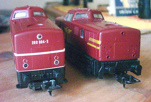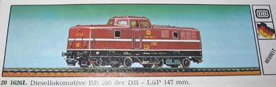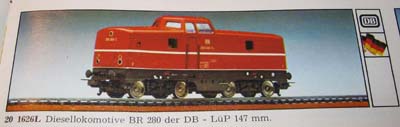 1979/80 war erstmals ein Foto des tatsächlich erschienenen Modells zu sehen. Es trug die Betriebsnummer 280 004-4 und war damit der Epoche IV zuzurechnen. Für ca. 39,-- DM (ca. 20 EUR) konnte sich jetzt der Modellbahner eine günstige 280er auf seine Gleichstromschienen stellen. Ein Blick auf die Lok genügte aber um festzustellen, dass das Vorbild zwar von den Details gar nicht schlecht wiedergegeben wurde, das Modell aber einfach zu bullig wirkte. Hier kam beim Ankuppeln des Nahverkehrszuges geradezu ein Monster auf die Umbau 4-Achser zu. Besonders das Gehäuse oberhalb des Rahmens war vergleichsweise viel zu hoch. Die sonst gut wiedergegebene Darstellung der Lok (Lüfter, Klappen, Drehgestelle) wurde damit gleich wieder hinfällig, was sehr schade war. Warum hat Lima aber diese Maßabweichungen gewählt? Die Antwort dürfte ganz einfach sein: Das Maß des Lima Standard-Rundmotors. Er hätte sonst eben nicht in das Gehäuse gepasst, also wurde die Lok um den Motor herumgebaut. Man darf nicht vergessen, dass Lima damals nur auf diese eine Motorkonstruktion zurückgreifen konnte, die es in zwei verschiedenen Übersetzungsvarianten gab. Die Ausführungen beim Spielmodell können ja auch eine Antwort geben. |