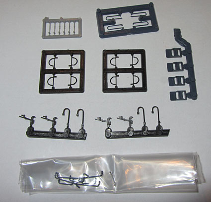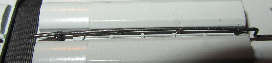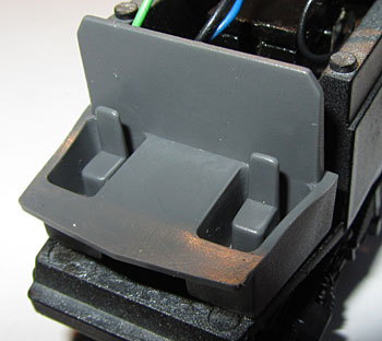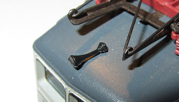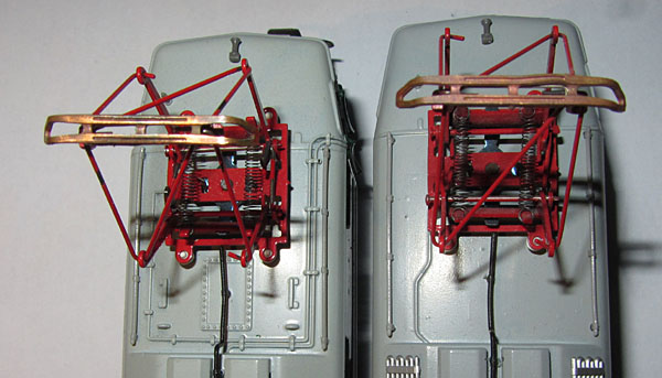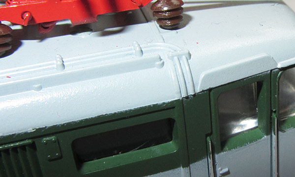 Links der Dachaufbau ohne die angegossenen Leitungen darunter, rechts mit der alten Leitungsnachbildung. Beide Fotos stammen vom selben Modell.  |