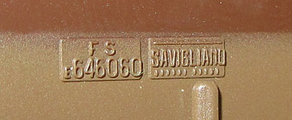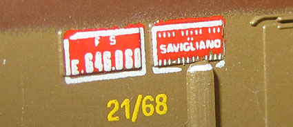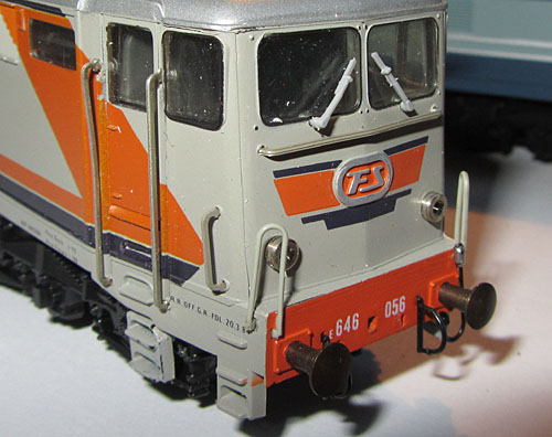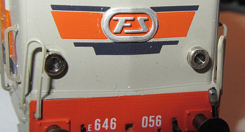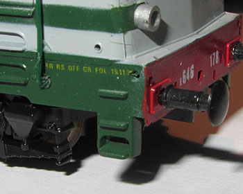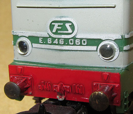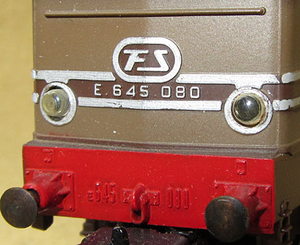 Die Betriebsnummer der Lok findet man auch an den Fronten. Dort sogar gleich zweimal, nämlich auf der Pufferbohle und dann in der Mitte der Front unterhalb dem FS-Logo. Es soll vorgekommen sein, dass es dabei Unstimmigkeiten gab und diese beiden Nummern nicht identisch waren (braune E645 080 mit E646 060 auf der Pufferbohle). Ein Beispiel kann ich derzeit aber hier noch nicht im Bild zeigen, daher ist dies noch fraglich und eine Vermutung aufgrund von einem Hinweis. Bei der Limakopie von Paya hat man das aber zur Perfektion gebracht und sowohl E645 080 wie auch E645 060 angeschrieben (siehe die spezielle Unterseite).  |