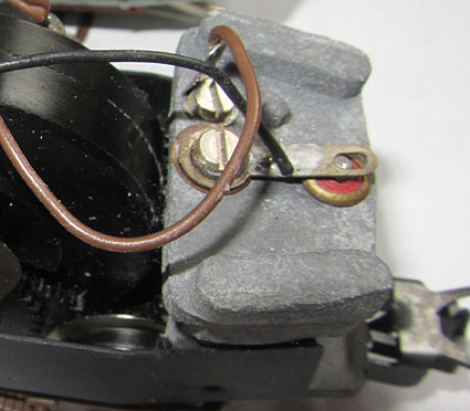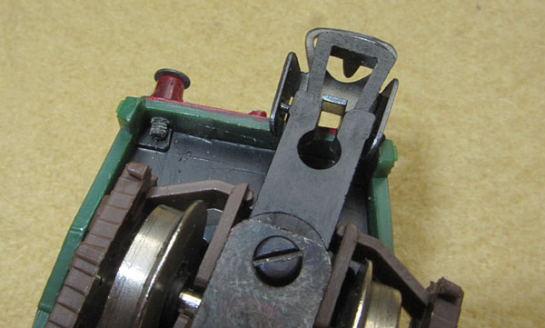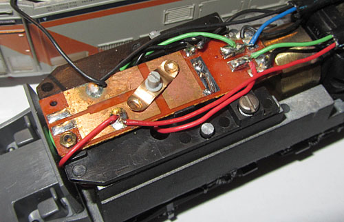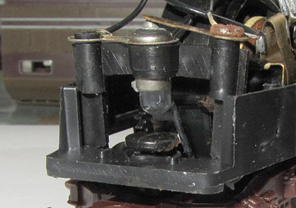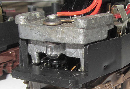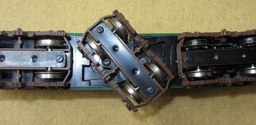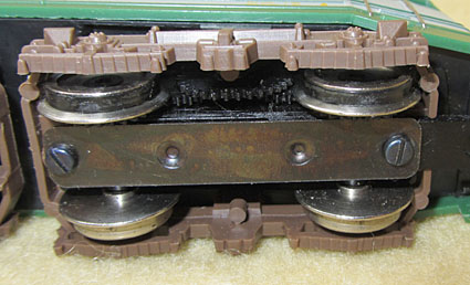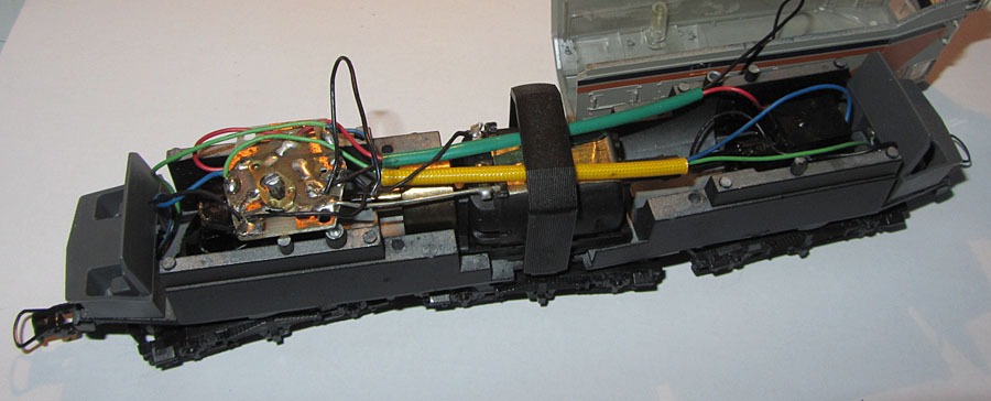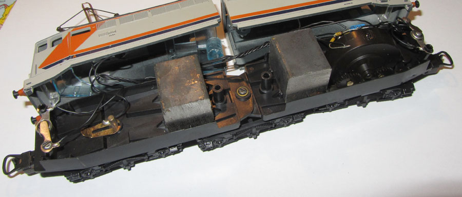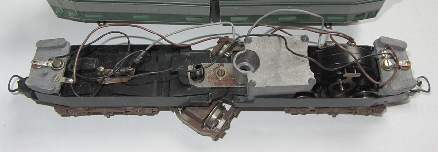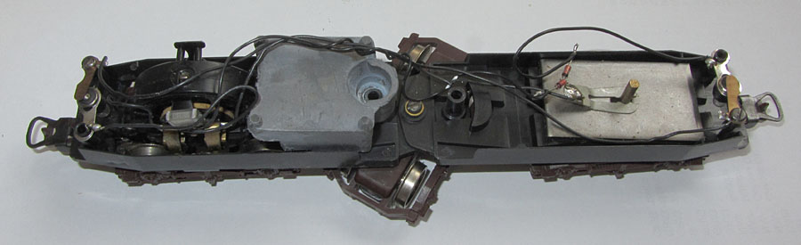 Das Innenleben ist dann ohne besondere Überraschungen. Der Lima Rundmotor treibt ein Enddrehgestell an. Dort wird auch von einer Schiene der Strom abgenommen. Das andere Enddrehgestell dient der Stromabnahme von der anderen Schiene. Das mittlere Drehgestell hat hier keine Funktion. Hier wäre also genügend Potential gewesen, die Stromabnahme zu verbessern, was leider nicht genützt wurde. So ist dies leider, wie bei allen Limamodellen der damaligen Zeit, ein ziemlicher Kritikpunkt.  |