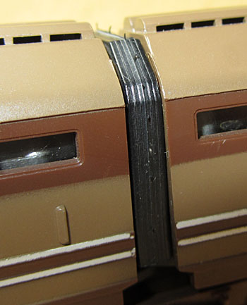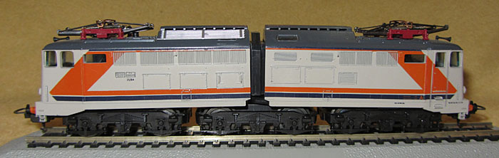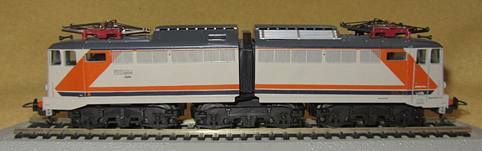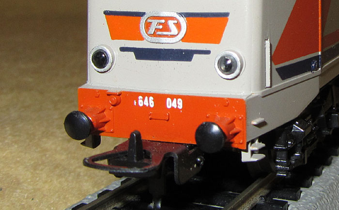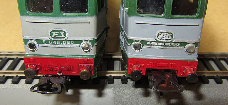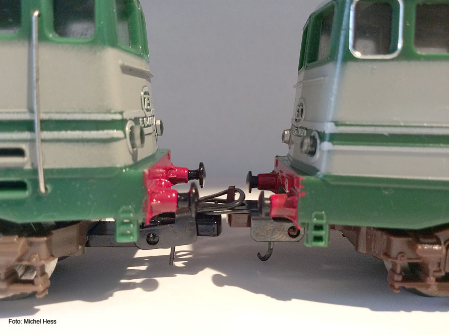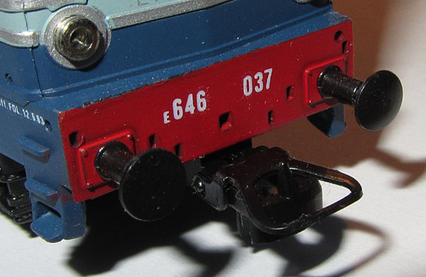 Die Modelle der E645 080 und E646 060 der 1. Generation kann man aufgrund einiger Details auch noch in zwei, eigentlich sogar drei Untergruppen trennen. Vermutlich 1978 kam es zu einer ersten Überarbeitung des Gehäuses, die man vor allem an zwei sehr offensichtlichen Merkmalen feststellen kann. So war bisher die rote Pufferbohle ein klares Rechteck. Nun wurde sie im unteren Bereich zwischen den Puffern nach oben ausgeschnitten. Dies diente dazu, dass der Kupplungsbügel der Universalkupplung weiter nach oben ausschwenken konnte und dadurch das Ankuppeln erleichtert wurde. Außerdem stellt man bei fast allen “alten” Modellen fest, die im Anlagebetrieb waren, dass mit der Zeit die Bügelkupplung den Zughaken an der Pufferbohle abgeschürft hat. Apropos Kupplungen. Die frühe Version wurde von Lima auch mit NMRA (X2F Horn-Hook) Kupplungen für den US-Markt hergestellt, möglicherweise auch mit Fleischmann-Kupplungen für den schwedischen Markt.  |