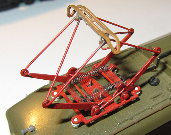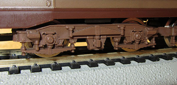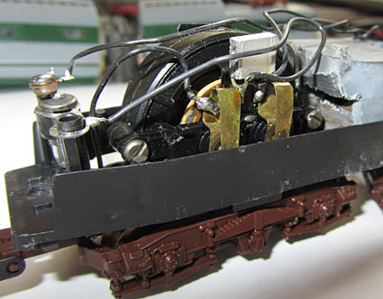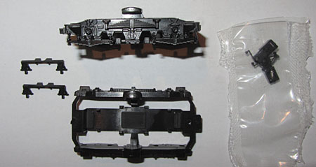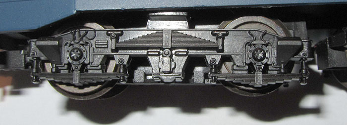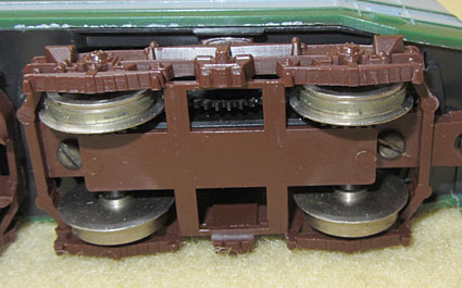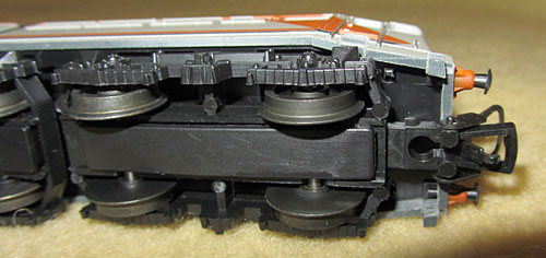 Im Inneren des Modells findet man einen Gussrahmen, der das Modell auf ca. 380 - 385 Gramm bringt. In der Mitte sitzt ein Mittelmotor, der über Kardanwellen und ein Schnecken-/Stirnradgetriebe die vier Achsen der äußeren Drehgestelle antreibt. Die Stromabnahme erfolgt mittels Drähten in eigenen Führungen auf den Achsen von diesen 4 Achsen und stellt damit eine breite Stromabnahmebasis dar.  |