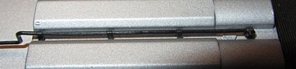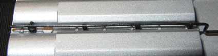 Nach diesen äußeren Details wird es Zeit, die E645/E646 auch einmal von innen anzusehen. So stellt sich zuerst die Frage, wie man das Gehäuse vom Rahmen abheben kann. Rastnasen oder Gehäuseschrauben findet man auf den ersten Blick nämlich keine und auch die Dachaufbauten sind nicht zum Ausklipsen geeignet (wie bei der Lima E444). Die Lösung ist ganz einfach. Man legt die Lok auf den Kopf und dreht das mittlere Drehgestell ca. 50 Grad nach links oder rechts. Hierzu muss mann evtl. ein wenig Kraft aufwenden, da die Spurkränze am unteren Gehäuserand anstoßen. Dann aber sieht man wunderschön die beiden Schlitzschrauben, die man nun durch die Drehgestellblende hindurch herausdrehen kann. Diese halten Gehäuse und Rahmen zusammen.  |