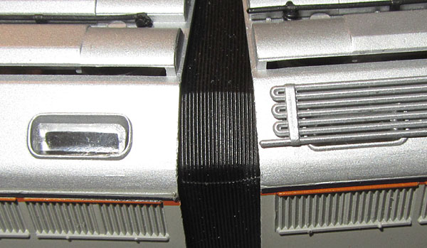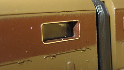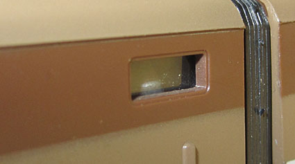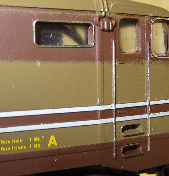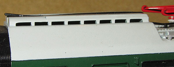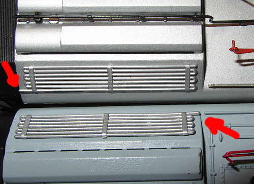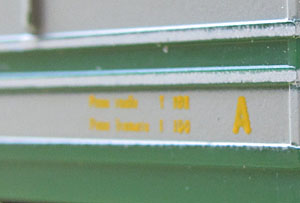 Das Vorbild besitzt zwei unterschiedliche Seiten, was Lima auch immer berücksichtigt hat. Daher sind die beiden Gehäuseteile auch unterschiedlich gestaltet, es ist also auch nicht nur eine spiegelbildliche Darstellung. So findet man beim Vorbild auf der linken Lokseite 6 Maschinenraumfenster und darunter 10 Lüftungsschlitze und auf der rechten Lokseite 3 Maschinenraumfenster, dann 2 Lüftungsgitter und wieder 2 Fenster. Darunter dann 4 Lüftungsschlitze, 2 Klappen, ein großes Lüftungsgitter und einen weiteren Lüftungsschlitz. Die linke und rechte Lokseite ergeben sich aus der Kennzeichnung des vorderen Gehäuseteils mit dem kleinen Buchstaben “A” unten neben der Führerstandstüre. Dieses findet man eben auf der Lokseite mit 6 Maschinenraumfenstern links.  |