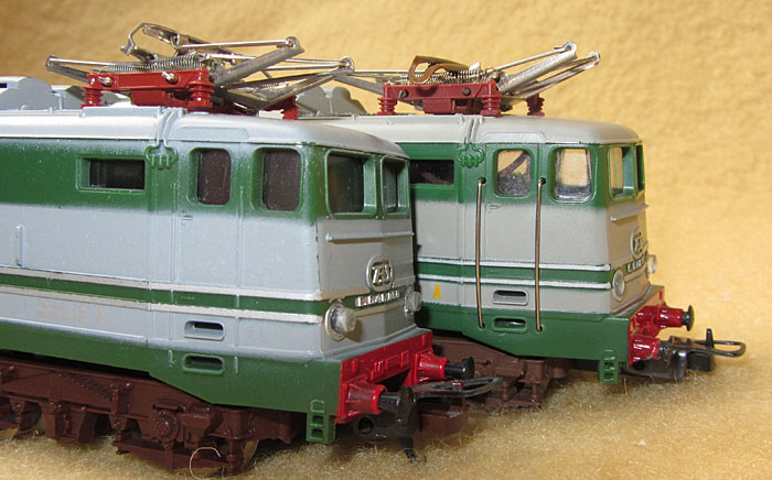 Bei der letzten Auflage der Lima E646 060 und E645 080, das sind die Modelle mit den Stromabnehmern mit der roten Kuststoffbasis gab es noch eine kleine Änderung, die erst auf den 2. Blick auffällt. Da muss man mir schon die Augen öffnen (danke Martin H.!). Diese Modelle sind tatsächlich ein wenig tiefer gelegt und wirken dadurch vorbildgerechter und nicht mehr so hochbeinig. Auch wurden jetzt die Räder brüniert und glänzten nicht mehr so deutlich. Die folgenden Bilder zeigen deutlich auch den Höhenunterschied, wenn man auf die Puffer blickt.  |