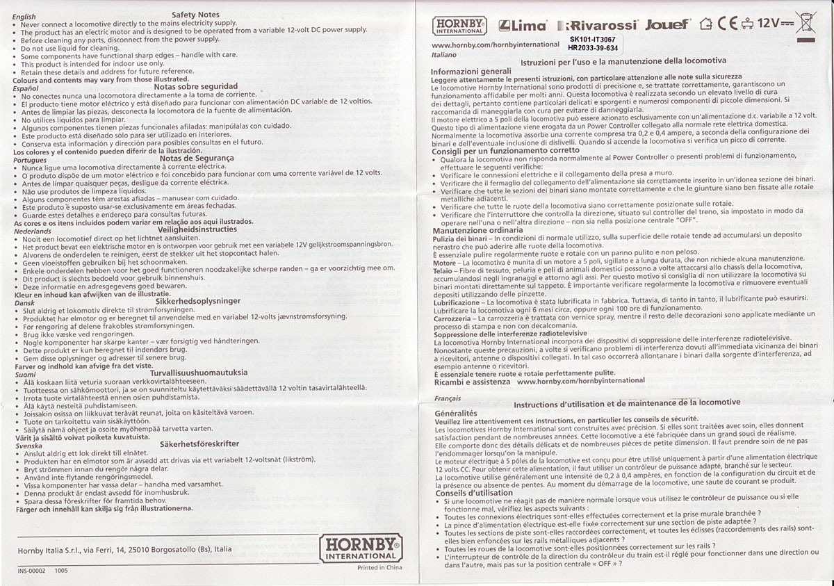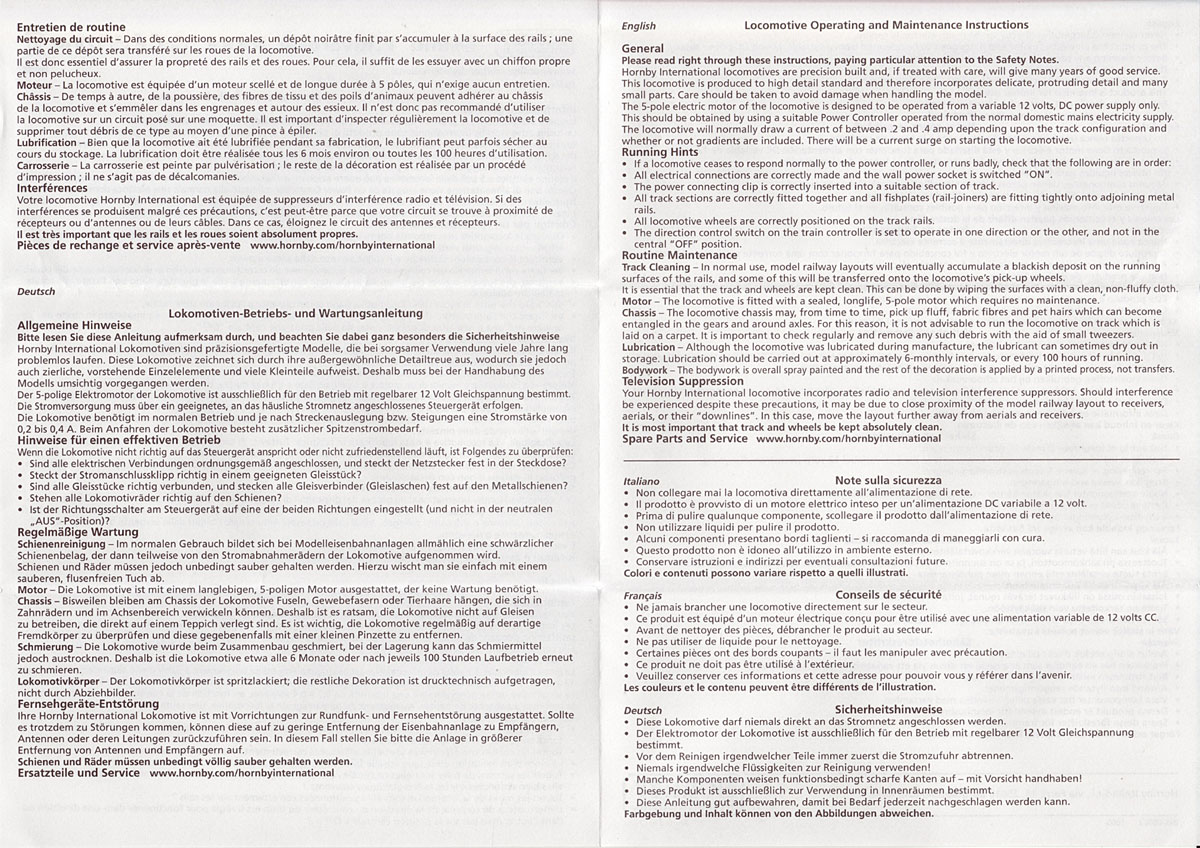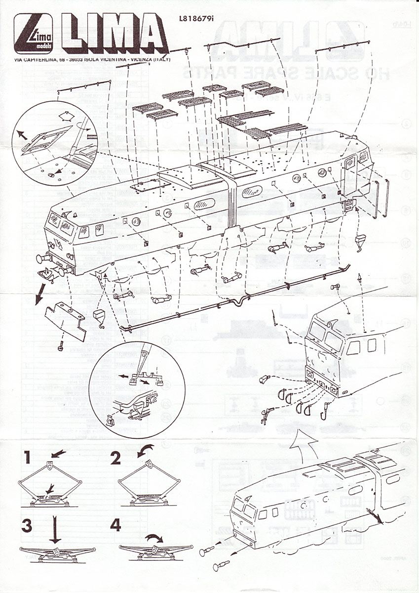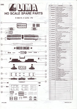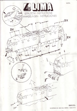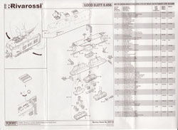 Hornby legte dann bei der Rivarossi E656 eine allgemeine Bedienungsanleitung in mehreren Sprachen bei. Dazu kam noch ein weiteres DIN A4 Blatt, das sowohl Ersatzteilliste, als auch bebilderter Hinweis zum Gehäuseöffnen usw. war. War ziemlich klein gedruckt, also Lupe raus. Bei den Zurüstteilen war noch ein kleiner Zettel mit Hinweisen zu deren Anbringung in der Tüte (hier nicht abgebildet). |