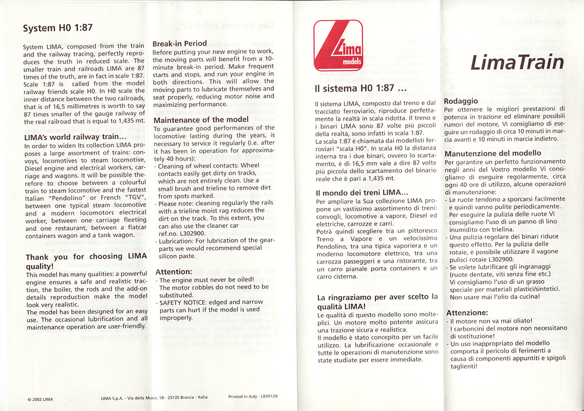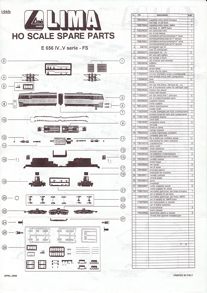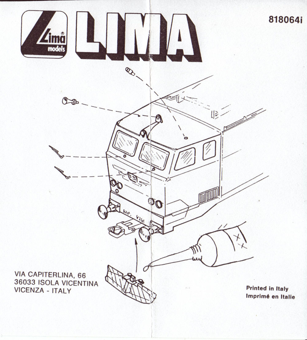 Hornby legte dann bei der Rivarossi E656 eine allgemeine Bedienungsanleitung in mehreren Sprachen bei. Dazu kam noch ein weiteres DIN A4 Blatt, das sowohl Ersatzteilliste, als auch bebilderter Hinweis zum Gehäuseöffnen usw. war. War ziemlich klein gedruckt, also Lupe raus. Bei den Zurüstteilen war noch ein kleiner Zettel mit Hinweisen zu deren Anbringung in der Tüte (hier nicht abgebildet). |