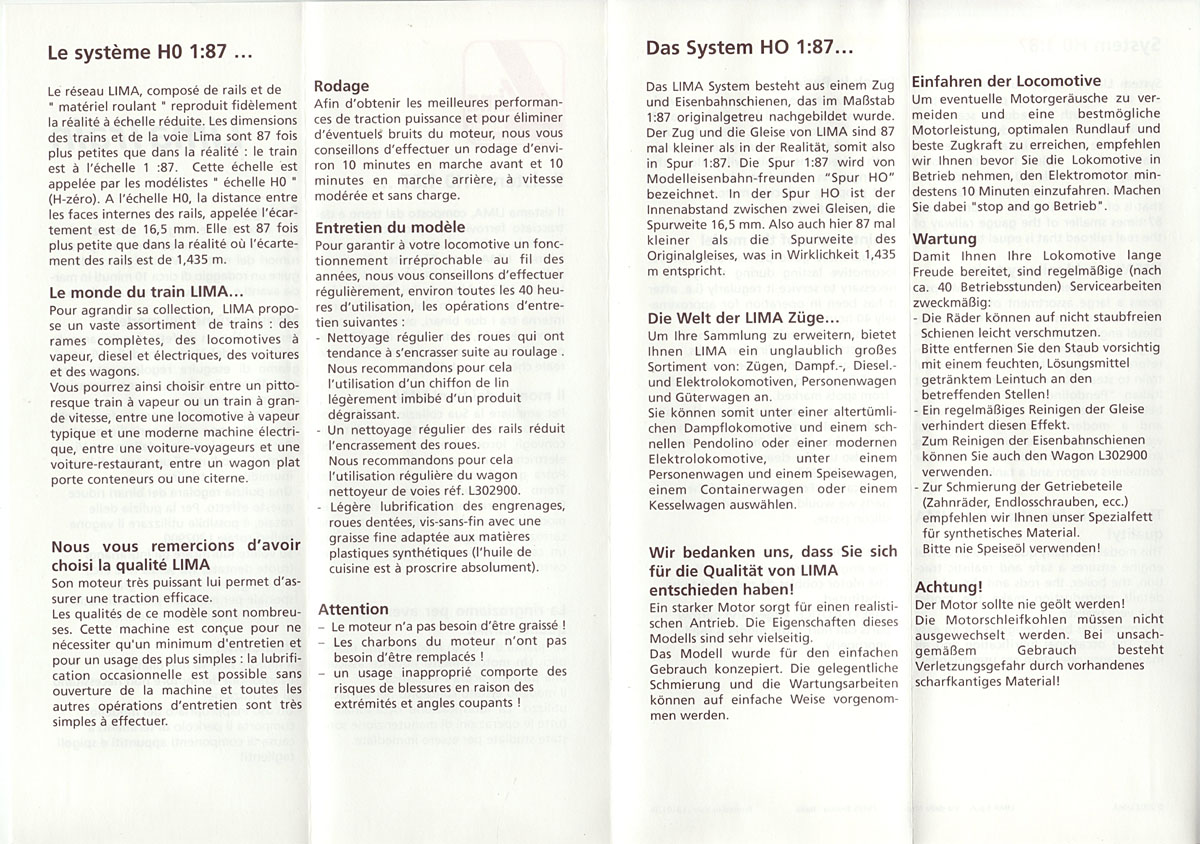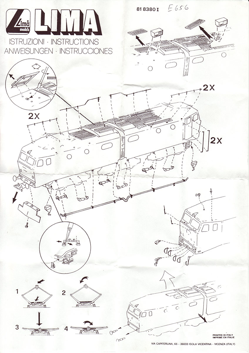 Bei den ersten Modellen der E656 lag keine Beschreibung bei. Lediglich wenn eine Oberleitungsumschaltung eingebaut war, dann gab es ein kleines Beiblatt mit einer kurzen Beschreibung und dem Bild einer britischen E-Lok. Erst mit der E656 519 und den ersten Zurüstteilen wurde auch deren Anbringung auf einem kleinen Zettel (10x11cm) bildlich dargestellt. Dazu gab es eine mehrsprachige Bedienungsanleitung auf einem DIN A4 Blatt, beidseitig bedruckt. |