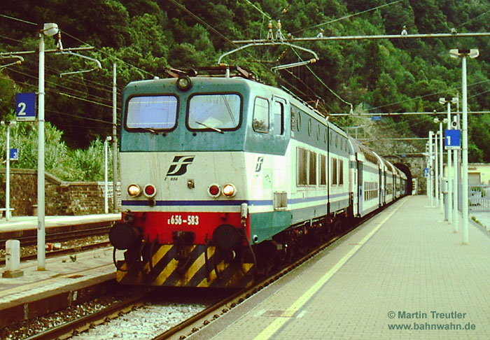 Die E656 583 gehört zur letzten Serie mit der Wendezugeinrichtung und der veränderten Front. Hier ist sie am 21.07.2002 an der Cinque Terre in Monterosso im Einsatz |