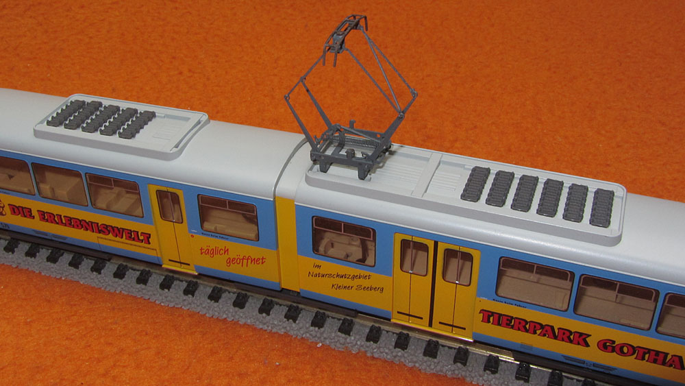 Scherenstromabnehmer auf A-Teil, zur Wagenmitte versetzt. A-Teil mit 6 Bremswiderständen, B-Teil mit 5 Bremswiderständen.