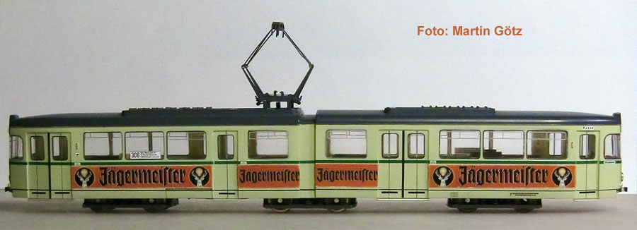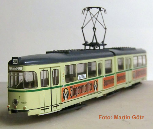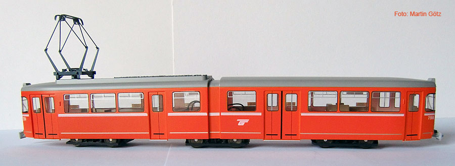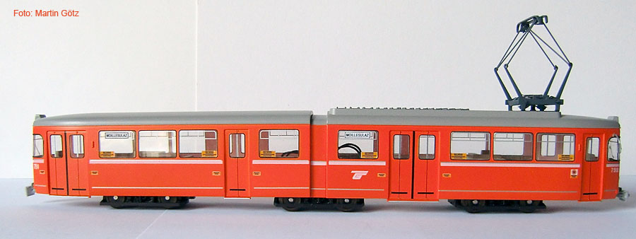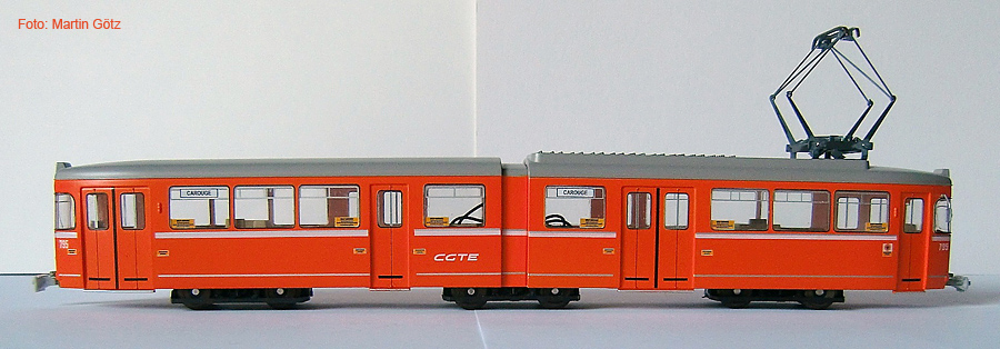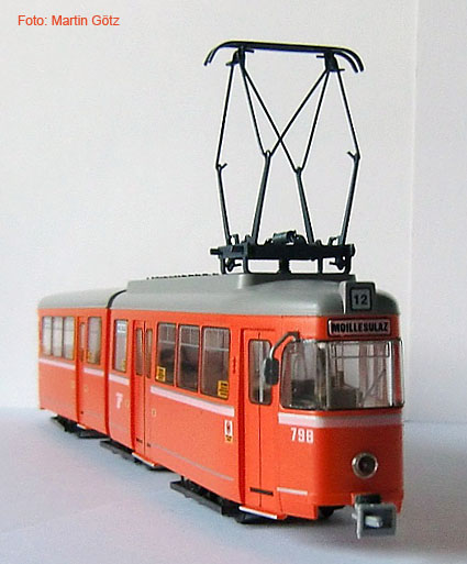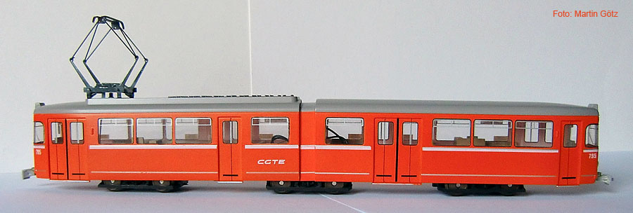 | Zudem hat sich Martin Götz mit seinen Modellen der orangen Genfer GT6 beschäftigt. Hier seine Informationen dazu: “Bei beiden Modellen ist die Bedruckung äußerst unvollständig. Ich habe deshalb selber Druckknöpfe zum Türöffnen (leider auf den Fotos sehr schwer zu sehen) und die dazugehörige Beschilderung ergänzt. Dies übrigens nur auf der rechten Seite, da die Fahrzeuge in Genf offensichtlich nur im Einrichtungsbetrieb eingesetzt wurden. Auf der linken Seite muss nichts ergänzt werden, dort sind die Limamodelle vorbildgerecht (bis auf den kleinen Schönheitsfehler, dass das Logo des Verkehrsbetriebs dort auf dem falschen Wagenteil aufgedruckt wurde). Dazu bekamen die Modelle noch einen anderen Stromabnehmer, einen Außenspiegel sowie Scharfenbergkupplungen. Damit kommen die Modelle wesentlich näher an das Original heran”. Die folgenden Fotos zeigen die beiden geänderten Modelle und ihre Details. |