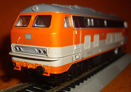 kieselgrau/orangen Farbgebung der City Bahn. Wie schon bei der EVB Ausführung stimmte auch hier die Anordnung der Lüfter und der Dachbereich mit dem Vorbild leider nicht überein. Das Vorbild war eben eine 218,