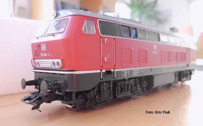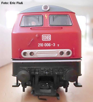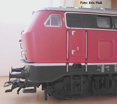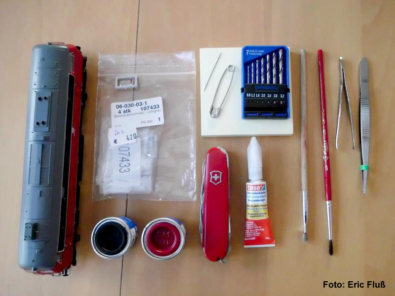 Zunächst werden die "OEM-Puffer" herausgezogen und mit einem 2mm HSS-Bohrer von Hand die Vertiefungen für die Puffer vorgebohrt. Hierzu kann vorab die hinter der Pufferbohle eingesteckte Leiste für die Rangiertritte aus den Nasen einfach in Richtung Drehgestell herausgehebelt werden. Nach dem Vorbohren erfolgt ein Nachbohren mit einem 2,3 mm Bohrer. Auch dies wieder von Hand, was gut funktioniert. Die Reste der Einsteckhülsen können hernach vorsichtig mit einem scharfen Messer abgeschnitten werden. Mit der Stechahle des Schweizer-Taschenmessers nun ein wenig entgraten und einen Puffer zur Probe einschieben. Falls nötig, weiter mit der Ahle die Öffnung drehend weiten. Keine Angst, das geht gut. Falls beim Entgraten etwas Farbe mit weggekratzt wird, diese später mit der Revell-Matt-Schwarz Nr. 8 beipinseln. Die Weinert-Puffer kommen im Pack 2x gewölbt und 2x flach. Für das Anbringen gilt die RRR-Regel: Die Lok im RÜCKEN, der RECHTE Puffer RUND. Nun nacheinander die Lage der Puffer seitlich und von oben kontrollieren und mit einem Zahnstocher o. ä. umlaufend ein wenig Sekundenkleber anbringen. Nicht in die vorgebohrte Öffnung geben, sonst verkleben die Puffer und federn nicht mehr!! Ist mir leider beim ersten Puffer passiert! Ist dies ringsum erledigt, sind die UIC-Steckdosen an der Reihe. Zur Lagebestimmung ist ein Vorbildfoto hilfreich. Alsdann mit einer Stopfnadel vorkörnen, mit einer Sicherheitsnadel nachkörnen und dann wieder von Hand mit einem 0,8 mm Bohrer das Löchlein Bohren. Die vorher bemalten Steckdosen am Dorn mit ein wenig Sekundenkleber benetzen und mit einer Pinzette in die Öffnung schieben und ausrichten. An der Pufferbohle kann nun noch mit dem schwarzen Mattlack um die Pufferhülsen herum ein wenig nachcoloriert werden, falls notwendig. Der rote Lack passt gut zum Farbton der Lok. Farbabplatzer an den Griffstangen habe ich mit Haftnotizen am Lokkasten abgeklebt und ausgebessert. Hier das Ergebnis, was ganz gelungen scheint. Das ganze Prozedere hat für mich als üngeübten Grobmotoriker ca. 90 min gedauert. Die falsche Griffstange habe ich belassen. |