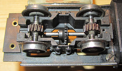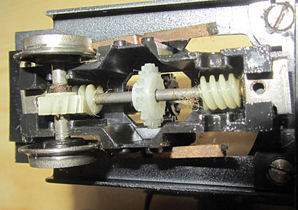 Hier im Bild auf der linken Seite das offene Getriebe der V100 001 rot mit den Federdrähten,