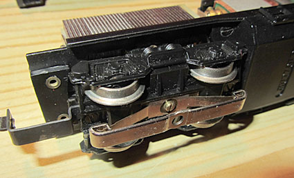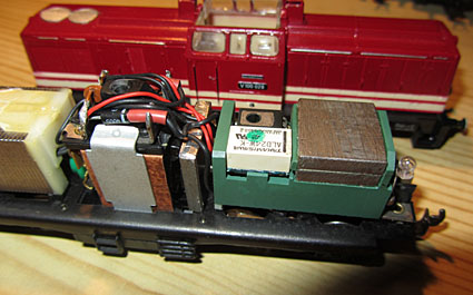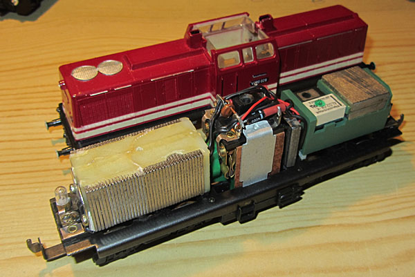 Für das Umschaltrelais, bzw. den Digitaldecoder muss man dann ein wenig Platz schaffen und eines der Gewichte etwas verkleinern. Dann kann dieser dort platziert werden. Im gezeigten Modell wurde einseitig ein spezieller Plastikklotz eingepasst und zudem beschwert. Sieht sauber aus. Da ich den Umbau nicht selber gemacht habe, kann ich leider nicht sagen, ob dieser Block mit exakter Aufnahme für ein Umschaltrelais nicht möglicherweise als Kleinserie zu bekommen war. Er ist zu perfekt für eine “Handarbeit”. |