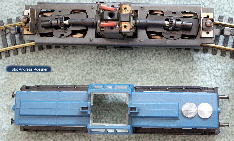 Von Andreas Roesner habe ich zudem noch weitere wertvolle Tipps erhalten, die sicher auch anderen Freunden der V100 nützlich sind. Dass die Piko/Gützold V100 ja noch immer eine der Innovationen der Modellentwicklung war, hatte ich ja schon erwähnt. Der kabellose Aufbau, der sowohl die Produktion, wie auch die Wartung vereinfachte ist heute noch beeindruckend. Andreas weißt aber auch auf die Schwachstellen hin, wie das Wellenlager des Motors und die Radscheiben der Achsen. Im Lauf der Zeit und bei Benutzuzng des Modells lockern sich die Metallradreifen auf den Plastikradscheiben. Darauf folgt der bekannte torkelnde Lauf der Piko Loks. Mit einem guten Klebstoff ist das aber mit geringem Aufwand zu beheben. Der Radring ist im Rundlauf auszurichten und mit flüssigem Klebstoff auf der Innenseite des Rades zu betropfen, bis die Spalte zwischen Radscheibe und Radring ausgefüllt ist. Mit Acrylkleber hält das extrem gut und die Achsen laufen wieder perfekt. Die Motorenlager bohrt Andreas für einen entsprechende Kugellagersatz auf, diese bekommt man recht günstig zu kaufen. Dadurch wird der Motor so richtig drehfreudig und gewinnt an Kraft. Wichtig anzumerken bleibt noch der Einbau der kleinen Entstörkondensatoren. Dazu werden MKT Typen verwendet, die sind klein, bipolar und gut. Das Gehäuse kann zudem verbessert werden mit der Verwendung von zusätzlichen Roco Lüfterhutzen, beidseitigen Hörnern und acht neue Griffstangen. |