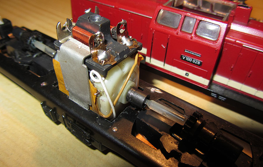 Eine Möglichkeit zur Verbesserung der Fahreigenschaften ist auch die Verwendung eines neuen Motors. Es muss ja nicht gleich ein Faulhaber sein, denn für den Preis kann man sich dann bestimmt drei V100er kaufen. Aber ein Mabuchi Motor passt ziemlich gut in die Aufnahme des bisherigen Piko Motors und verbessert die Fahreigenschaften doch spürbar. Jetzt muss aber etwas Verkabelung sein. |