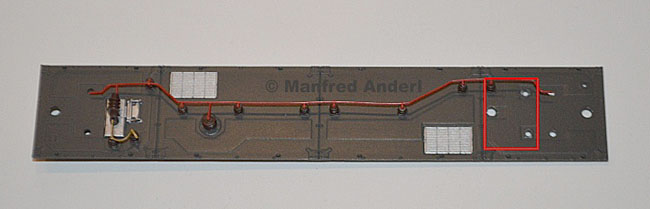 Nun sind die Bohrungen für den dritten Stromabnehmer in den Dachaufbau zu setzen. Sehr von Vorteil ist es dabei, dass die Auflagen auf dem Dach formtechnisch bereits vorhanden sind.