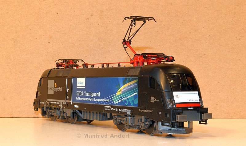 Der MRCE Taurus mit der Seitenwerbung für ETCS/Trainguard wurde von Manfred Anderl einer kleinen, aber optisch auffälligen Ergänzung unterzogen. Das Vorbild besitzt nämlich 3 Stromabnehmer, während Piko das Modell immer nur mit 2 Stromabnehmern fertigt. Die Bastelarbeiten sind eher unkompliziert und die Wirkung ist vorbildgerecht, wie ich hier zeigen darf.