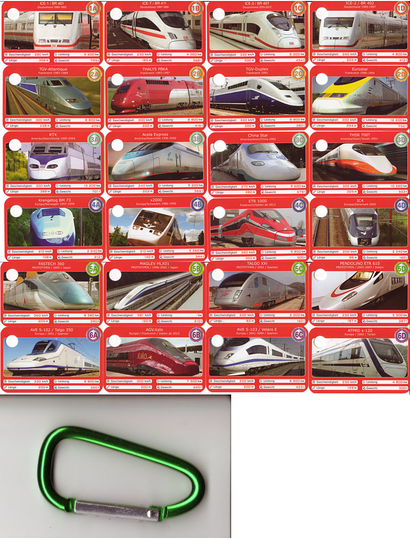 gelocht und es liegt ein Karabinerhaken (grün) bei, um damit die Karten z. B. am Gürtel zu befestigen. Inhalt wie Karabinis Dampfloks von 2012, nur Rückseite verändert.