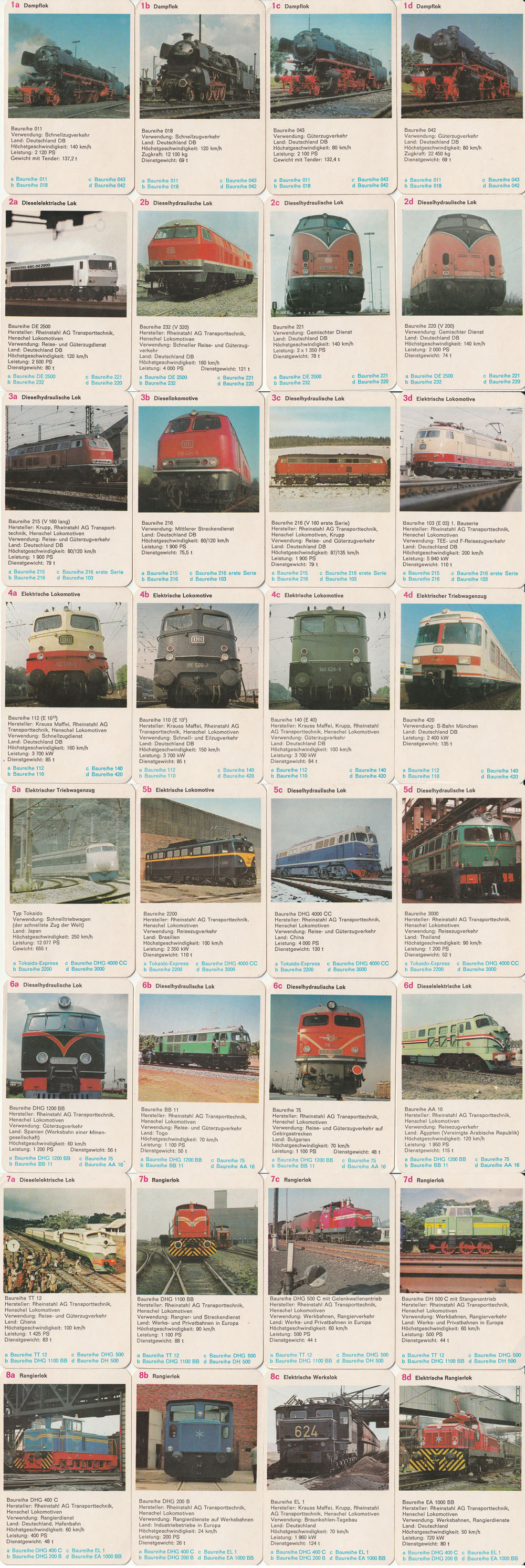 Loks weltweit, z. B. DB 120 001, RENFE S250, FS E656, USA, China, Burma u. a.