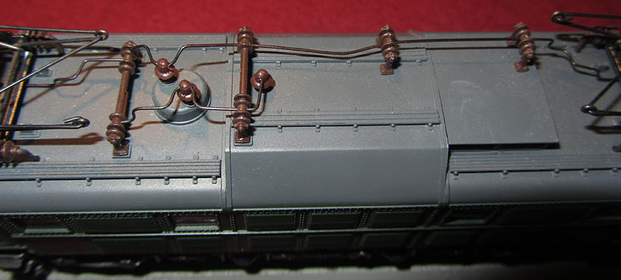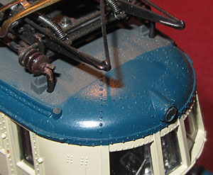 Die Umschaltung auf den Oberleitungsbetrieb erfolgt an einer Seite im Rahmenbereich durch einen kleinen silbernen Schalter, der sich gut versteckt im Rahmen verbirgt. Eingerichtete Führerstände gibt es nicht, aber eine Trennung, damit das Licht der Glühbirne nicht den ganzen Führerstand anstrahlt. |