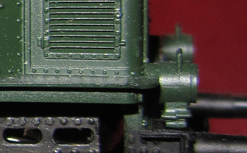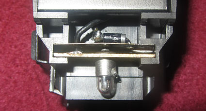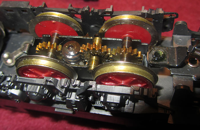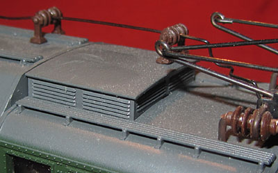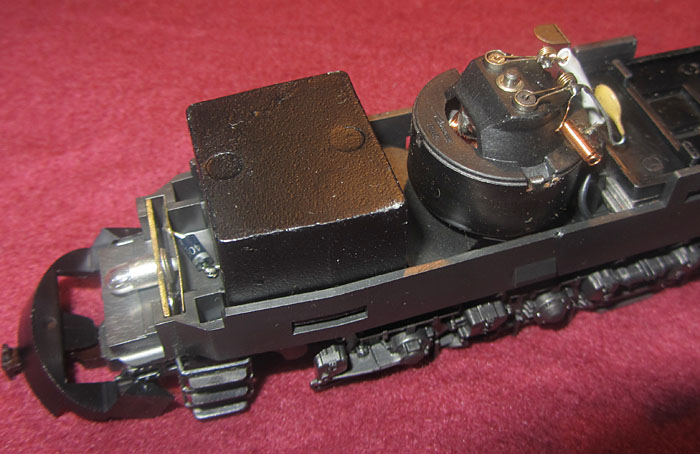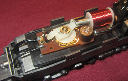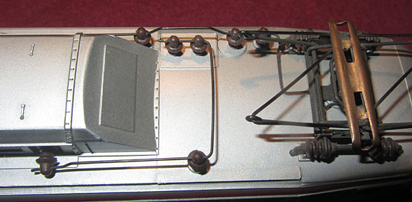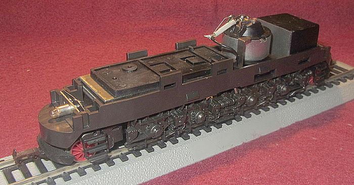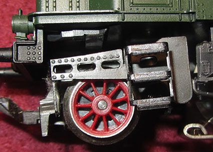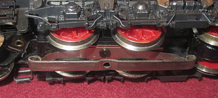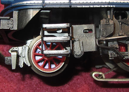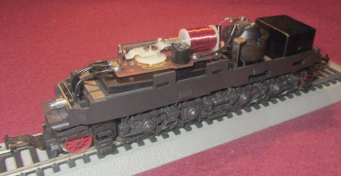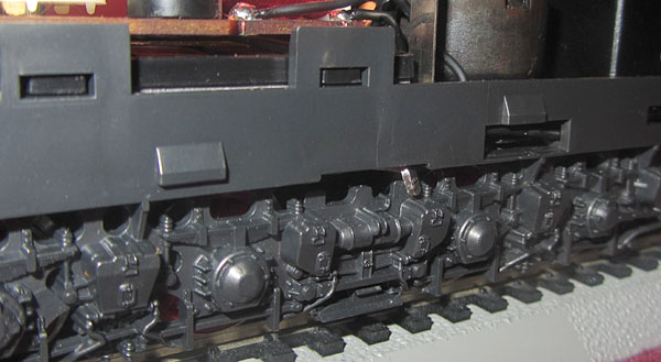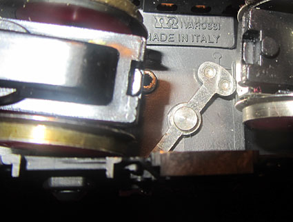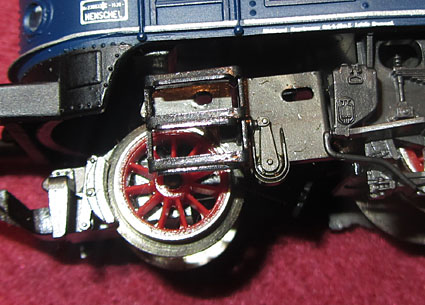 Bei den Wechselstromversionen wurde an der Stelle das Umschaltrelais angeschraubt und der Schleifer wurde ebenfalls unter den nicht angetriebenen Rädern der Lokseite 1 angebracht. Da bei der Gleichstromversion nur 2 Radsätze zur Stromabnahme dienen, ist die Stromabnahmebasis relativ klein und kann im Fahrbetrieb zu Problemen führen. Bei der Wechselstromversion verbessert der Mittelschleifer zwar die Stromabnahmebasis erheblich, aber eine Stromabnahme aller Räder wäre natürlich wünschenswert gewesen. |