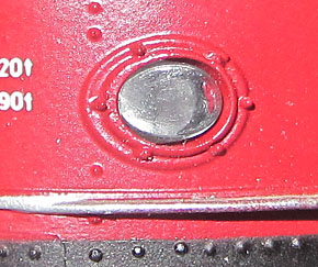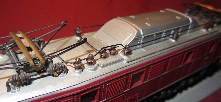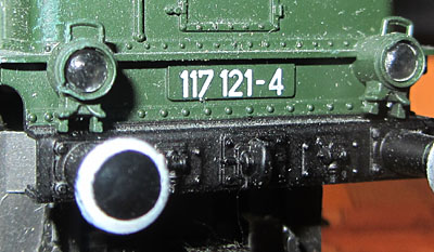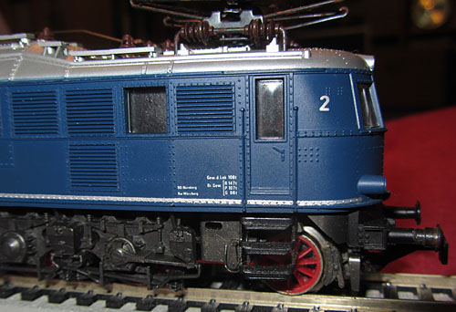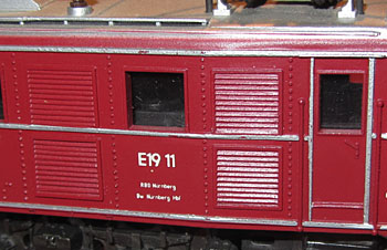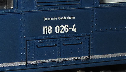 Bei allen drei Modellen der E19/119 wurden die Fabrikschilder im Bereich des Führerstands nachgebildet (Foto rechts oben). Der Anbringungsort ist dort richtig und auf Fotos bis in die Epoche IV nachvollziehbar, aber die Ausführung ist deutlich zu groß geraten und vor allem das Fehlen des schwarzen Hintergrunds hat mich da schon immer gestört. |
