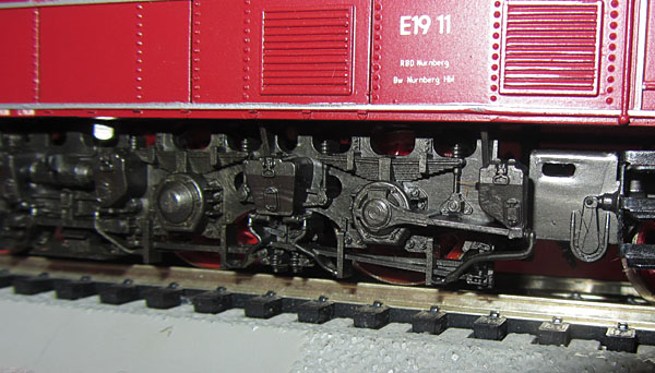 Die Übernahme dieses Fahrgestellrahmens für die 117 und 118 entsprach aber eben nicht diesen Vorbildern, da dort das Bremsgestänge innenliegend war. Schade, denn beim genauen Hinsehen fiel dieser Fehler dann doch auf, auch wenn sein Entstehen rein produktionstechnisch völlig nachvollziehbar war. Nach heutigen Ansprüchen wäre dies eine Todsünde, die in den einschlägigen Foren im Internet geradezu zu Lynchaufrufen geführt hätte. Zum Glück war man da Anfang der 1970er Jahre deutlich lockerer (bzw. hatte kein Internet...hahaha) und war froh, ein bestimmtes Modell überhaupt zu erhalten. Daher sollten wir es heute auch locker sehen und einfach akzeptieren. Es genügt, wenn man um die Fehler weiß und ihn akzeptieren kann. Dies gilt auch für den Indusimagneten der roten E19 11 der Epoche II - aber es gibt ja Bastelmesser. |