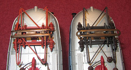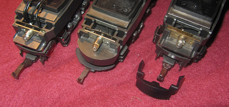Jetzt liegt also das Innenleben der Modellfamilie vor uns, das sich in den Jahren der Produktion nicht wesentlich verändert hat. Beginnen wir mit dem “Chassis” als solchem. Schon von außen ist klar, dass sich die 117 mit ihren Vorbauten und die 118/119 mit ihren stromlinienförmigen Fronten wesentlich unterscheiden. dem hat Rivarossi auch Rechnung getragen und entsprechend wurde der aus Kunststoff gefertigte Rahmen unterschiedlich ausgeführt. Dies änderte sich aber im Lauf der Produktion. So wurde der Rahmen der 117 als Basis genommen und auch für die 118/119 verwendet. Die erforderliche Rundung an der Front wurde jetzt einfach durch ein eingesetztes Kunststoffteil erreiche. Daran kann man schon erkennen, ob man eine 118/119 aus der alten Serie oder ein später gefertigtes Modell in der Sammlung hat. |