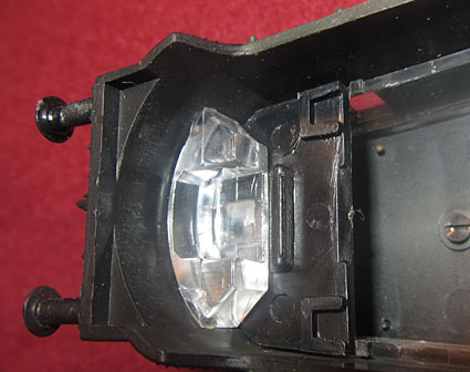 Jetzt stellt man fest, dass sich die beiden Rastnasen am Chassis und die entsprechenden Aussparungen innen im Gehäuse an einer Seite in unterschiedlicher Höhe befinden. Dieser Trick, damit man beim Wiederaufsetzen das Gehäuse auch korrekt auf das Chassis bringt, ist so einfach, dass er heute leider wieder in Vergessenheit geraten ist. Wie auch immer, der Motor ist unter dem Führerstand “2”. |